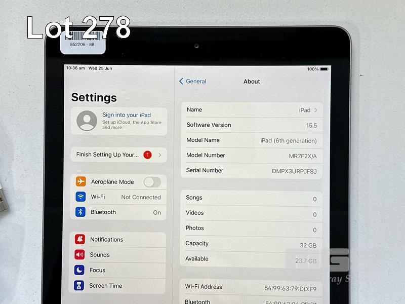 APPLE iPAD 6TH GEN, 32GB, Wi-Fi, SPACE GREY, MODEL MR7F2X/A, A1893 WITH CABLE & CHARGER (NOTE: MINOR SCRATCHES ON SCREEN) S/N:DMPX3URPJF8J
