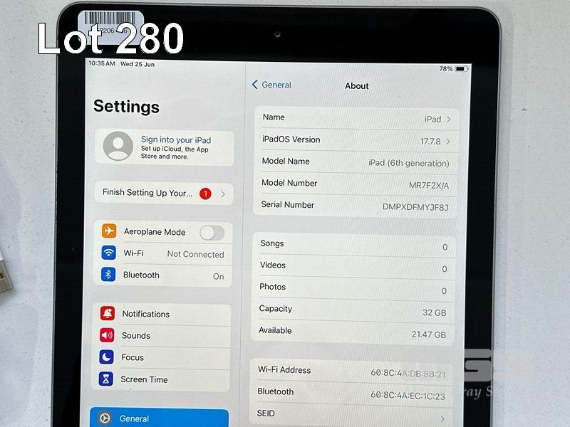 APPLE iPAD 6TH GEN, 32GB, Wi-Fi, SPACE GREY, MODEL MR7F2X/A, A1893 WITH CABLE & CHARGER (NOTE: MINOR SCRATCHES ON SCREEN) S/N:DMPXDFMYJF8J