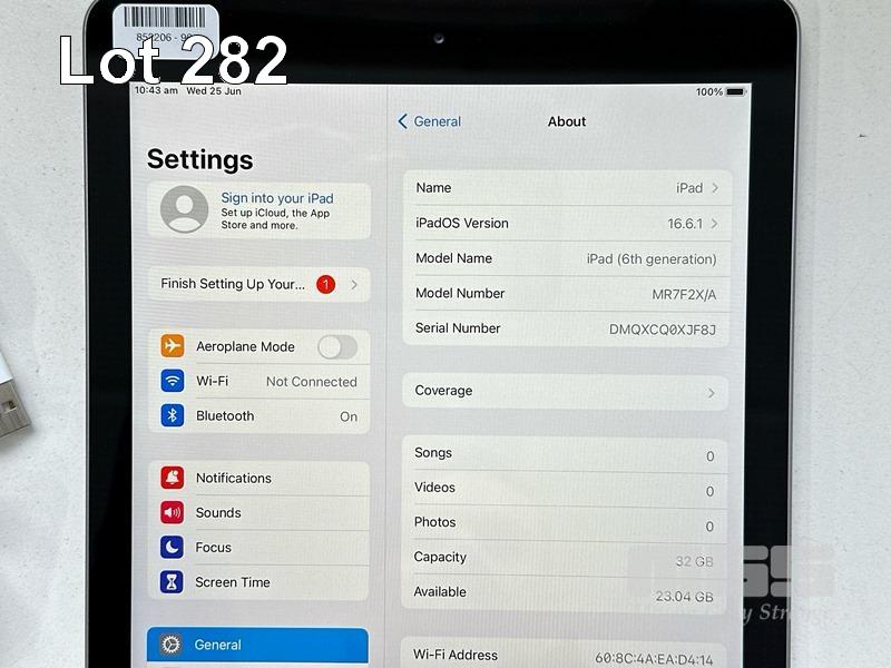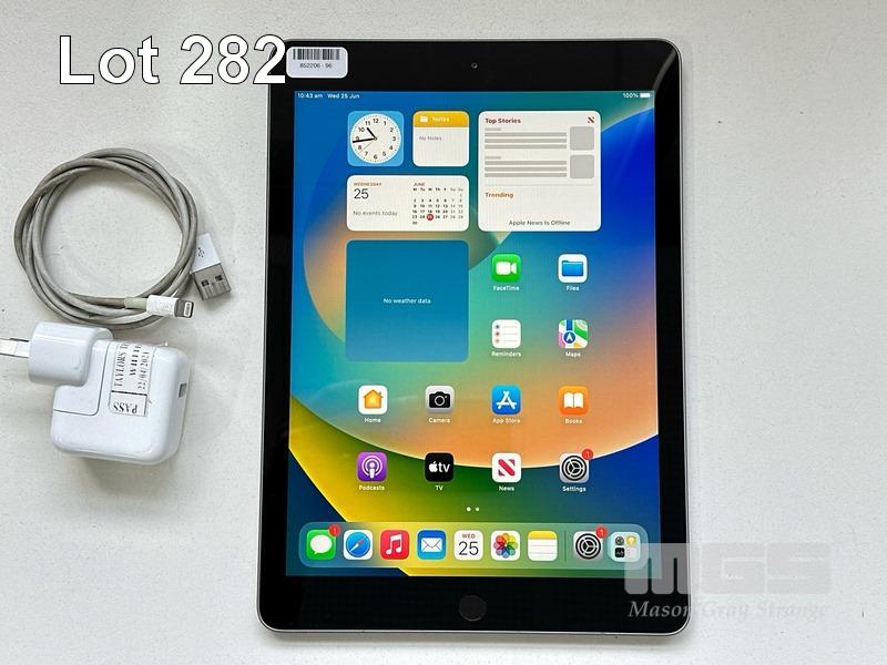 APPLE iPAD 6TH GEN, 32GB, Wi-Fi, SPACE GREY, MODEL MR7F2X/A, A1893 WITH CABLE & CHARGER (NOTE: MINOR SCRATCHES ON SCREEN) S/N:DMQXCQ0XJF8J