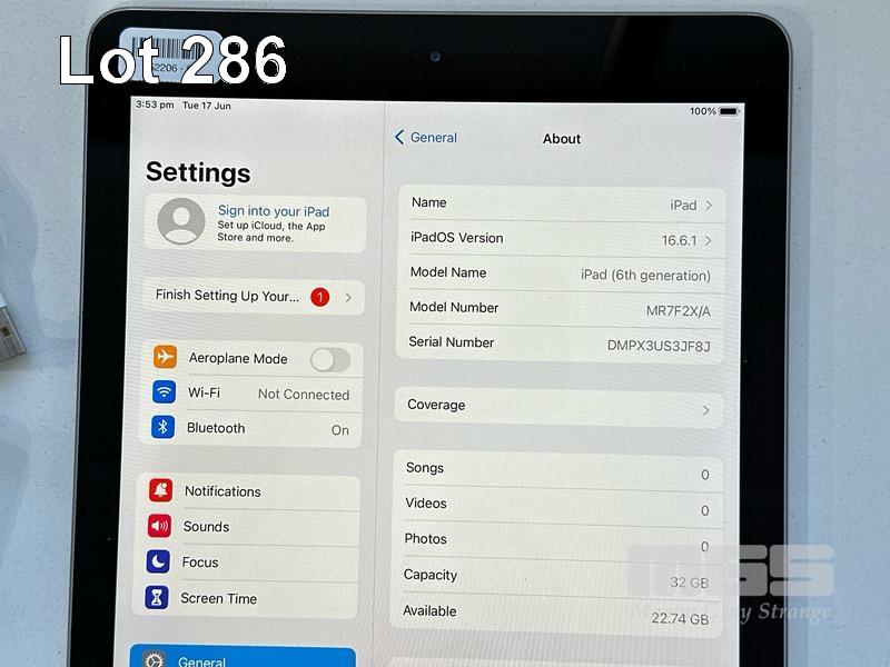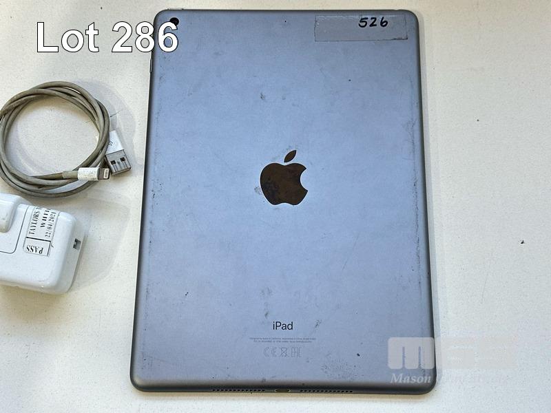 APPLE iPAD 6TH GEN, 32GB, Wi-Fi, SPACE GREY, MODEL MR7F2X/A, A1893 WITH CABLE & CHARGER (NOTE: MINOR SCRATCHES ON SCREEN) S/N:DMPX3US3JF8J