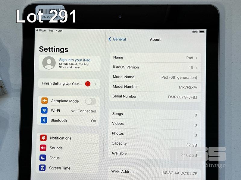 APPLE iPAD 6TH GEN, 32GB, Wi-Fi, SPACE GREY, MODEL MR7F2X/A, A1893 WITH CABLE & CHARGER (NOTE: MINOR SCRATCHES ON SCREEN) S/N:DMPXCYGFJF8J