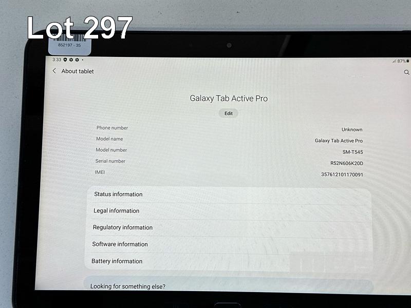 SAMSUNG GALAXY TAB ACTIVE PRO, 64GB, Wi-Fi, CELLULAR, MODEL SM-T545 (NO USB-C CABLE, NO CHARGER) (NOTE: MINOR SCRATCHES ON SCREEN) S/N:R52N606K20D