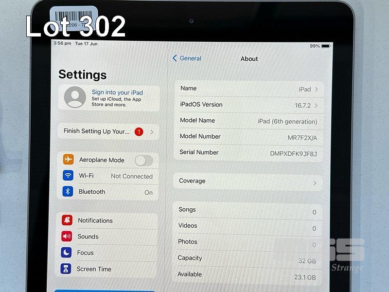 APPLE iPAD 6TH GEN, 32GB, Wi-Fi, SPACE GREY, MODEL MR7F2X/A, A1893 WITH CABLE & CHARGER (NOTE: MINOR SCRATCHES ON SCREEN) S/N:DMPXDFK9JF8J