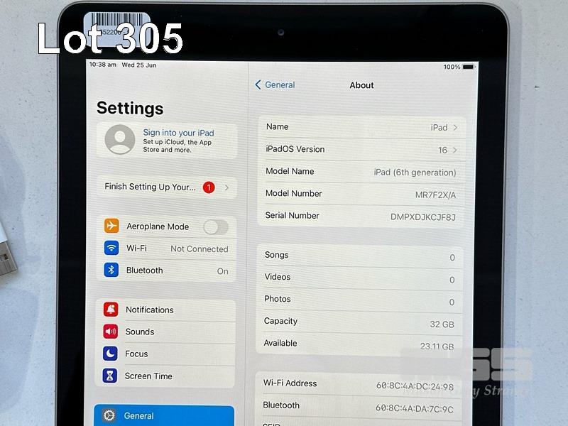 APPLE iPAD 6TH GEN, 32GB, Wi-Fi, SPACE GREY, MODEL MR7F2X/A, A1893 WITH CABLE & CHARGER (NOTE: MINOR SCRATCHES ON SCREEN) S/N:DMPXDJKCJF8J