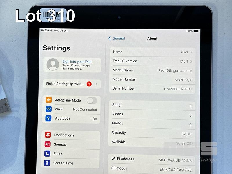 APPLE iPAD 6TH GEN, 32GB, Wi-Fi, SPACE GREY, MODEL MR7F2X/A, A1893 WITH CABLE & CHARGER