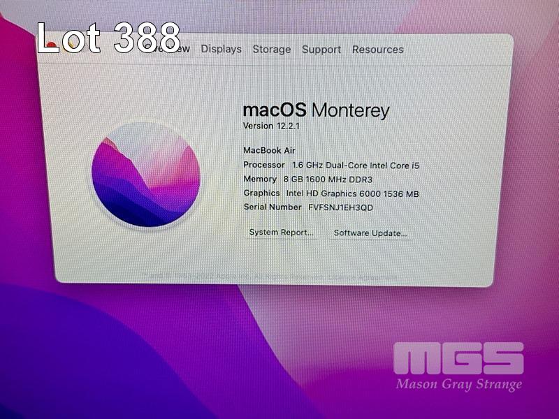 LAPTOP, APPLE MACBOOK AIR (A1466), CORE i5 5250U (5TH GEN) @ 1.6GHz, 8GB DDR3 RAM, 128GB SSD, 13.3" DISPLAY (1440x900), INTEL HD GRAPHICS 6000, Wi-Fi, BLUETOOTH, MAC OS 12 INSTALLED (NO POWER SUPPLY) (NOTE: BATTERY NOT CHARGING) S/N:FVFSNJ1EH3QD