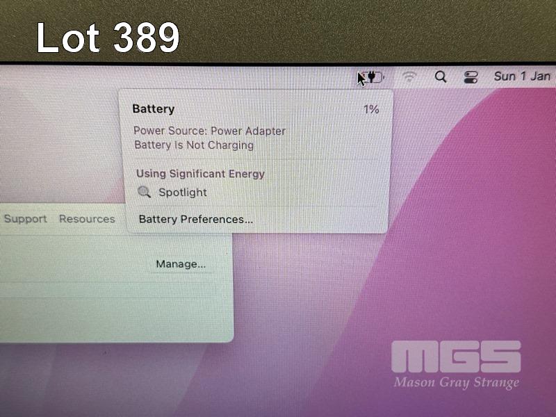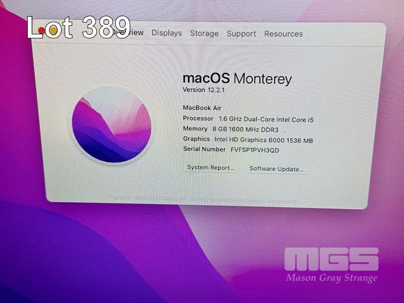 LAPTOP, APPLE MACBOOK AIR (A1466), CORE i5 5250U (5TH GEN) @ 1.6GHz, 8GB DDR3 RAM, 128GB SSD, 13.3" DISPLAY (1440x900), INTEL HD GRAPHICS 6000, Wi-Fi, BLUETOOTH, MAC OS 12 INSTALLED (NO POWER SUPPLY) (NOTE: BATTERY NOT CHARGING) S/N:FVFSP1PVH3QD