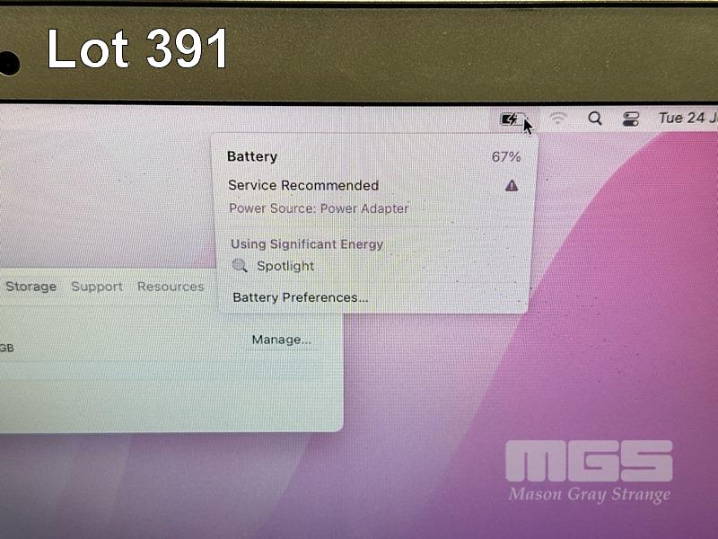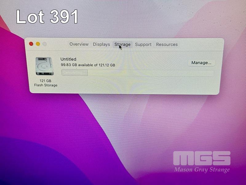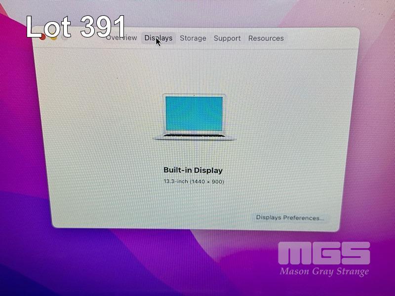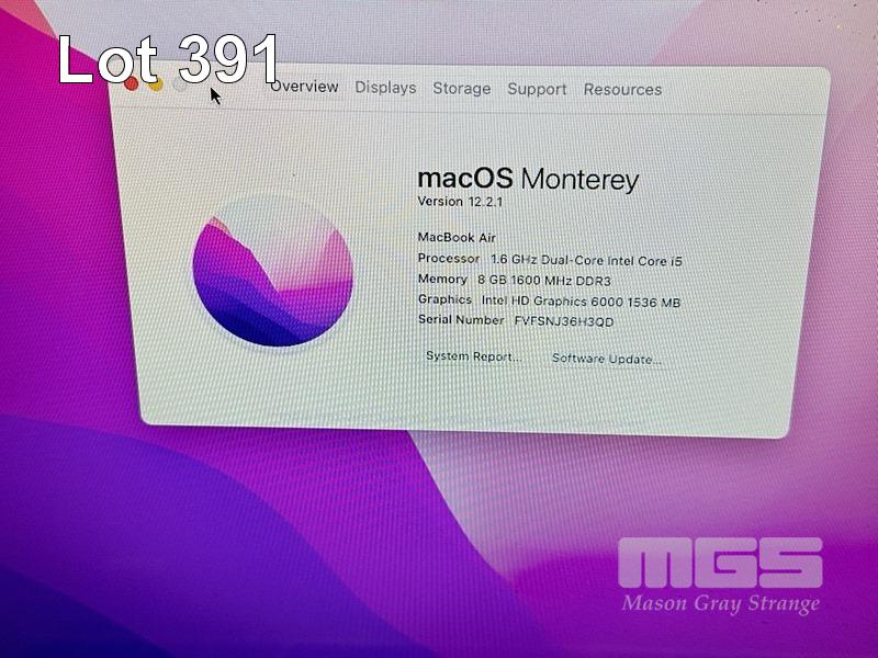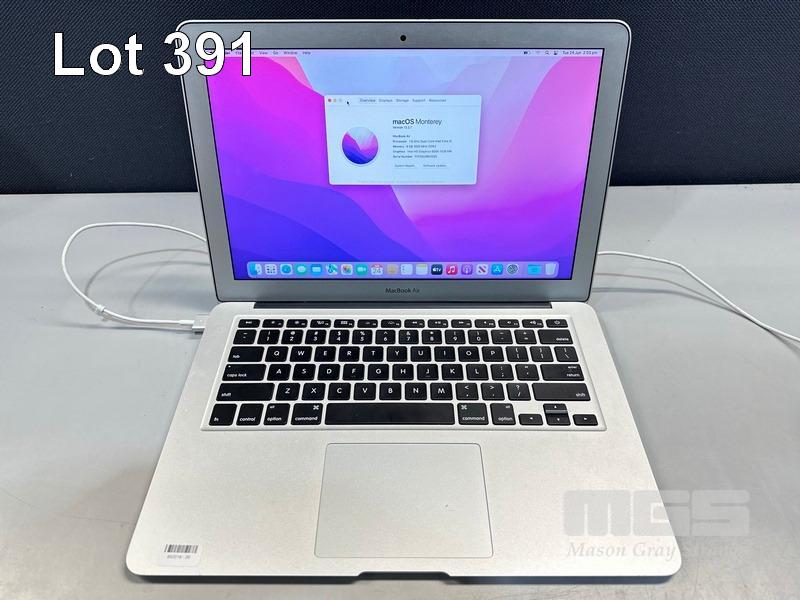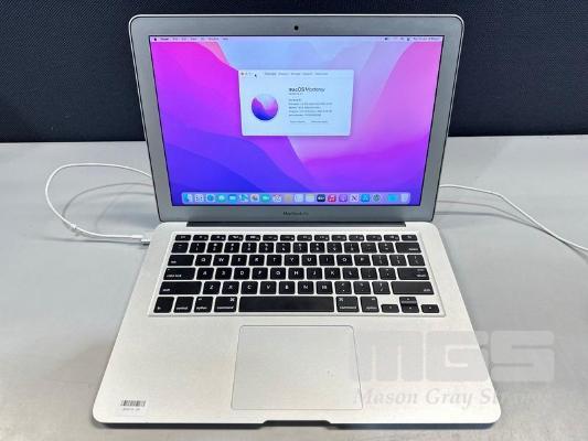 LAPTOP, APPLE MACBOOK AIR (A1466), CORE i5 5250U (5TH GEN) @ 1.6GHz, 8GB DDR3 RAM, 128GB SSD, 13.3" DISPLAY (1440x900), INTEL HD GRAPHICS 6000, Wi-Fi, BLUETOOTH, MAC OS 12 INSTALLED (NO POWER SUPPLY) (NOTE: "BATTERY SERVICE RECOMMENDED" MESSAGE, BATTERY NOT CHARGING) S/N:FVFSNJ36H3QD