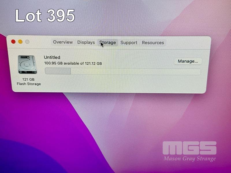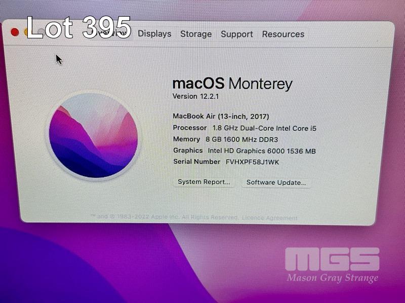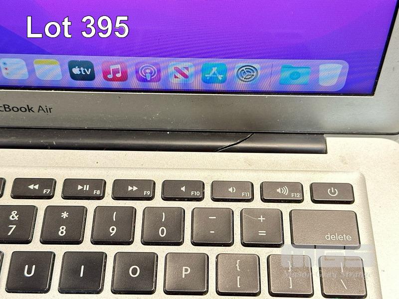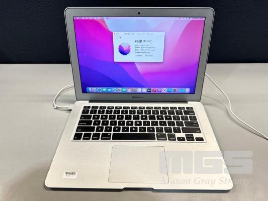 LAPTOP, APPLE MACBOOK AIR (A1466), CORE i5 5350U (5TH GEN) @ 1.8GHz, 8GB DDR3 RAM, 128GB SSD, 13.3" DISPLAY (1440x900), INTEL HD GRAPHICS 6000, Wi-Fi, BLUETOOTH, MAC OS 12 INSTALLED (NO POWER SUPPLY) (NOTE: DAMAGED SCREEN HINGE, "BATTERY SERVICE RECOMMENDED" MESSAGE, BATTERY NOT CHARGING) S/N:FVHXPF58J1WK