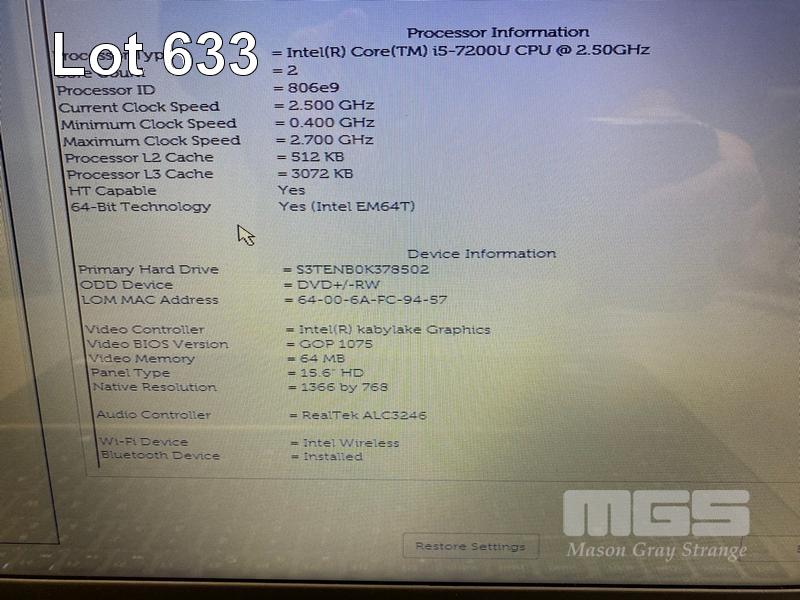 LAPTOP, DELL INSPIRON 15 5567, CORE i5 7200U (7TH GEN) @ 2.5GHz, 8GB DDR4 RAM, 128GB SSD, DVD-RW, 15.6" WIDESCREEN (1366x768), INTEL HD GRAPHICS 620, Wi-Fi, BLUETOOTH, WINDOWS 10 PRO INSTALLED & POWER SUPPLY (NOTE: MARKS ON SCREEN) S/N:9LDBJ22