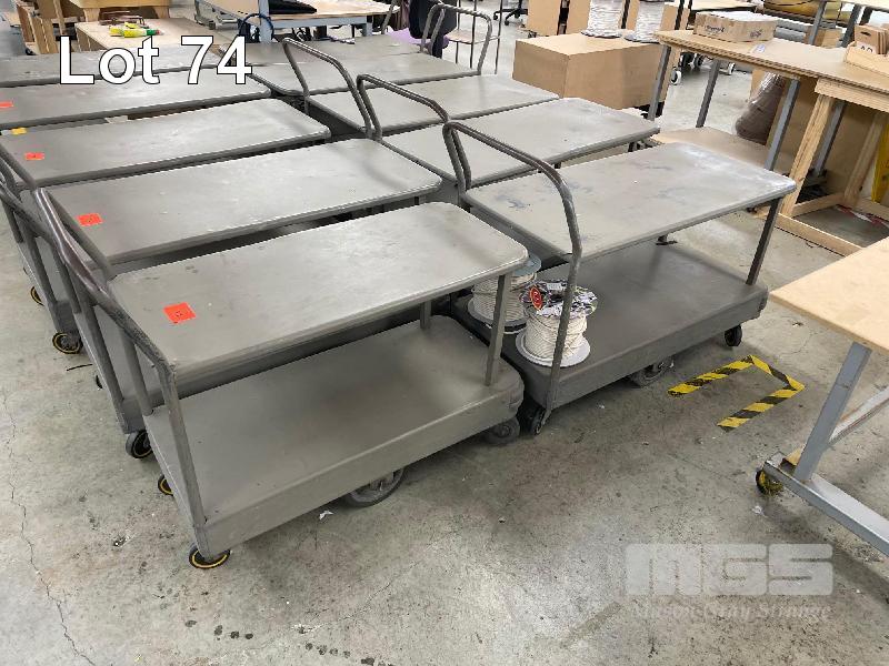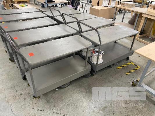 2 x STEEL STOCK TROLLEYS, 1100 x 500mm APPROX, 6 WHEEL, CENTRE PIVOT 2 TIER