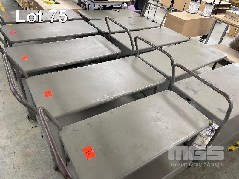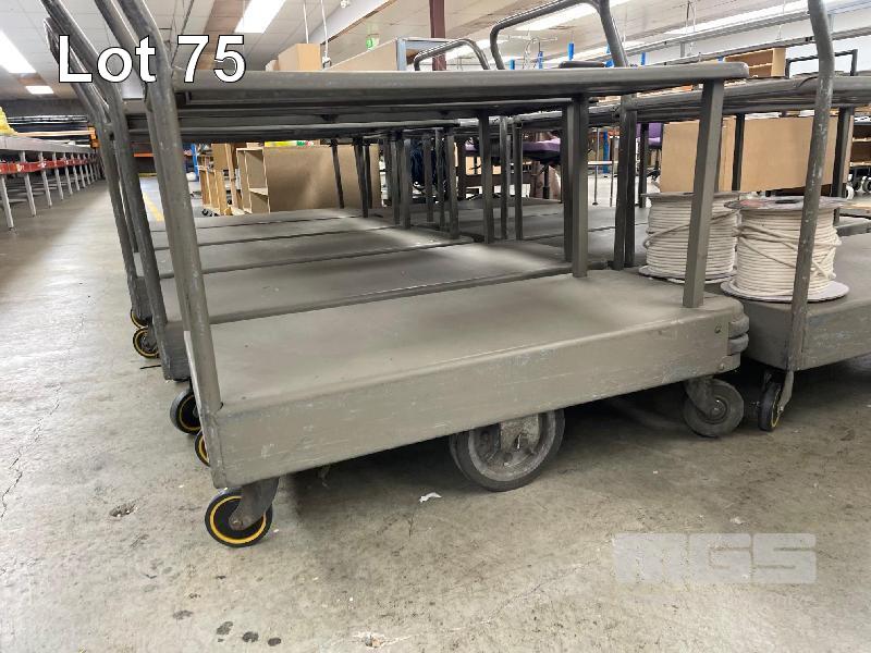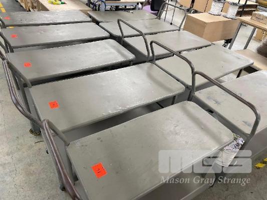 2 x STEEL STOCK TROLLEYS, 1100 x 500mm APPROX, 6 WHEEL, CENTRE PIVOT 2 TIER