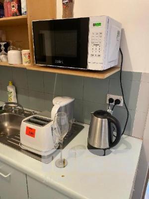 CONTENTS OF KITCHEN INCLUDING MICROWAVE, KETTLE, TOASTER, CROCKERY, CUTLERY, WASTE BINS & WATER FILTER