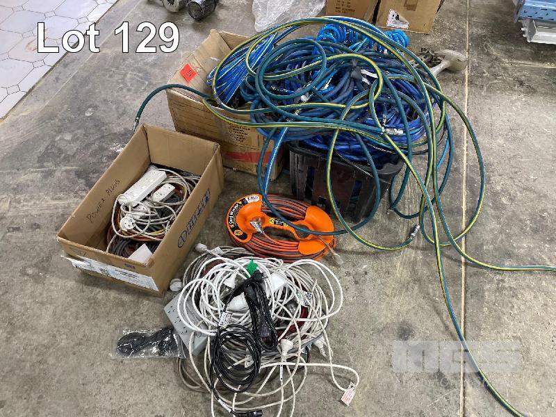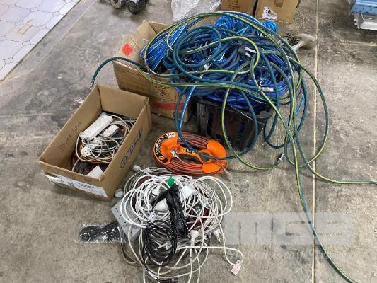 ASSORTED AIR HOSES & FITTINGS, NEW & USED, 240V EXTENSION CORDS & POWER BOARD