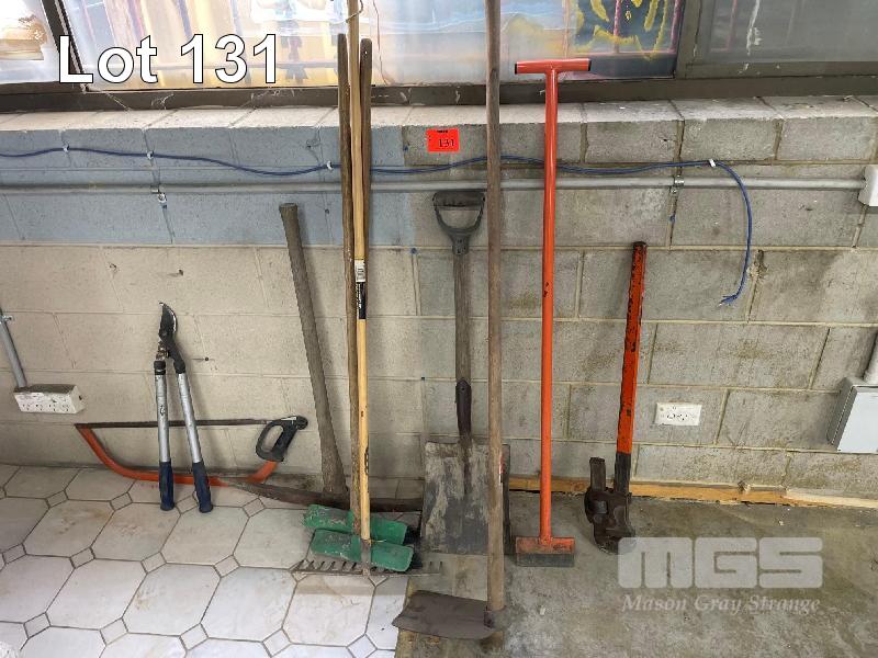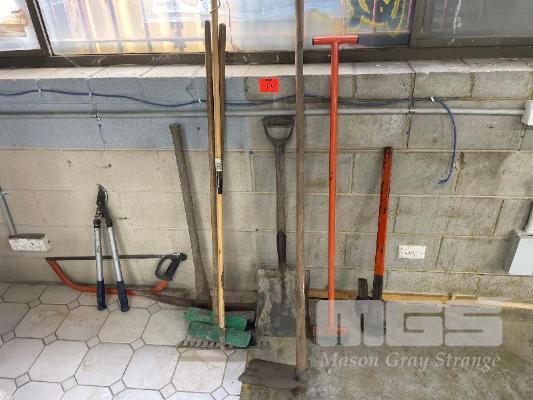 ASSORTED TOOLS, RAKE SAWM SNIPS, SHOVEL, LARGE PIPE GRIP