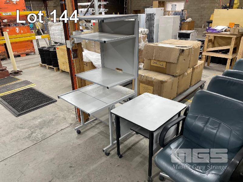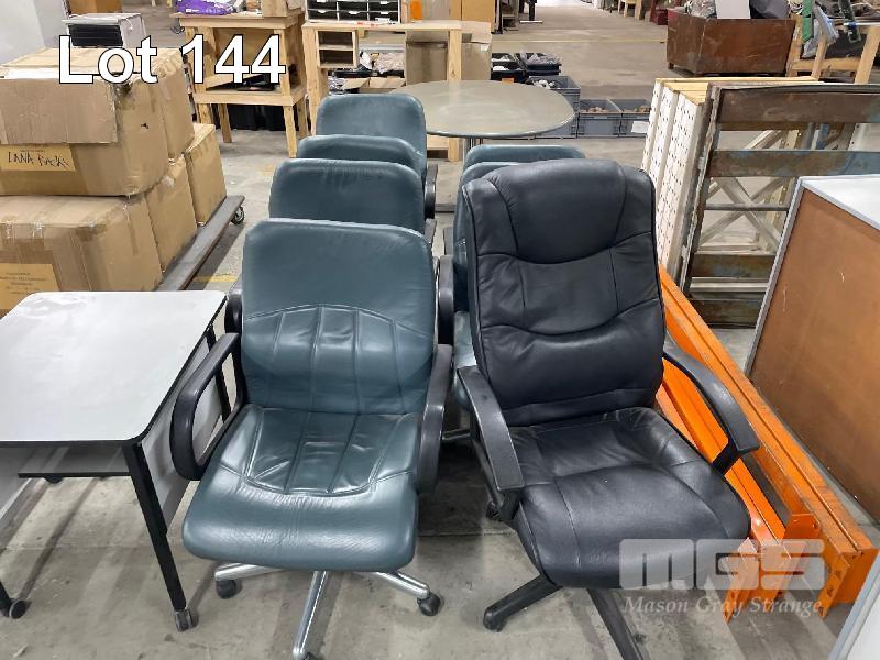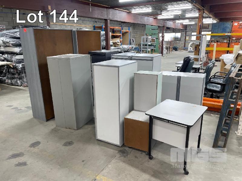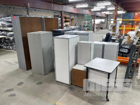 5 x 4 DRAWER FILING CABINETS INCLUDING 2 x STEEL & 3 x LAMINATE, LOWLINE CUPBOARD, 2 DOOR, LAMINATE CUPBOARD, 2 DOOR, 1800mm, LAMINATE BOOKSHELF, 2 DOOR, 7 x OFFICE CHAIRS, 2 x LOWLINE LAMINATE TABLES & MOBILE SHELF UNIT