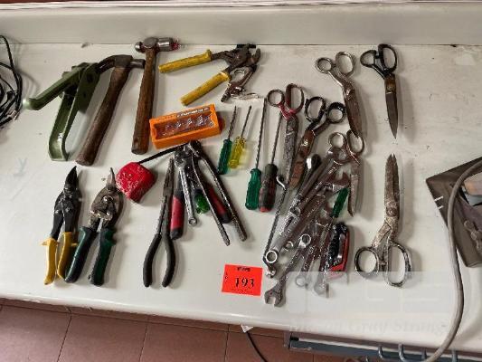 LARGE QUANTITY ASSORTED HAND TOOLS, FABRIC SCISSORS, TIN SNIPS, HAMMERS, SPANNERS, ETC