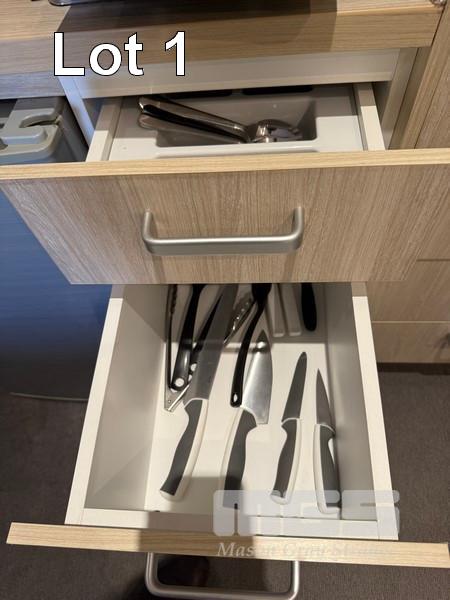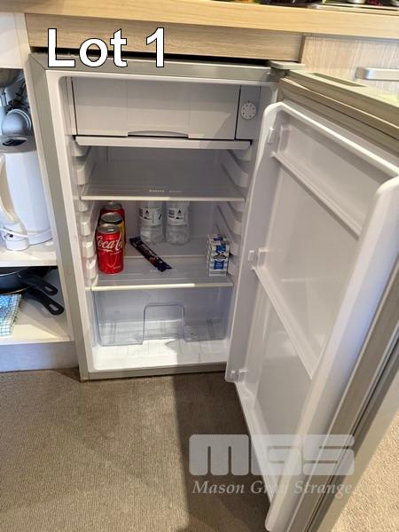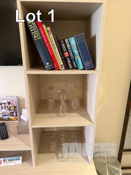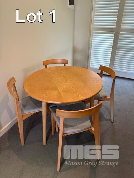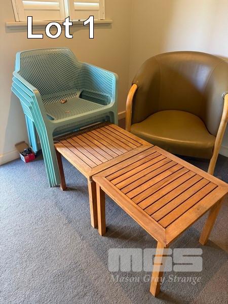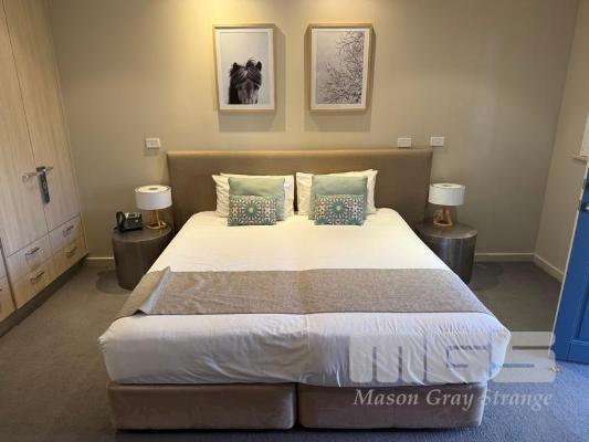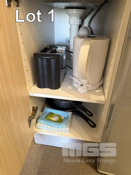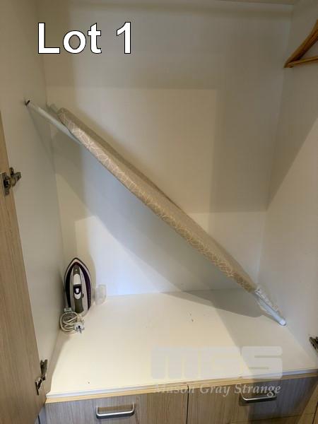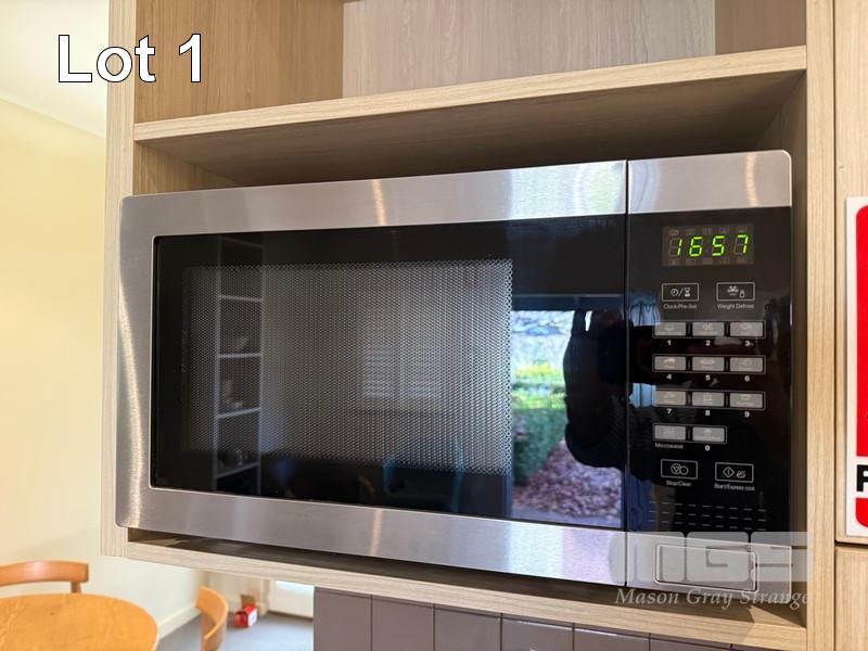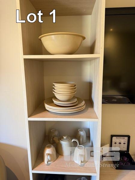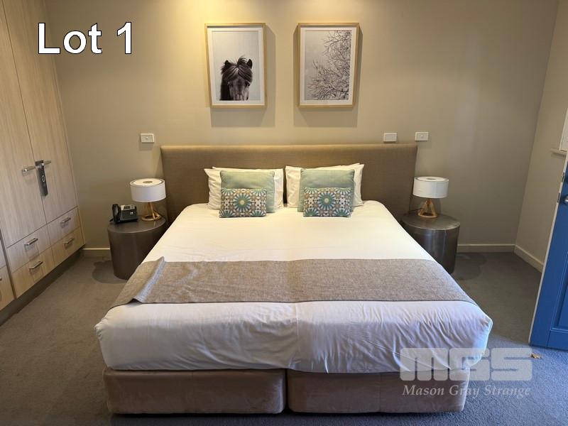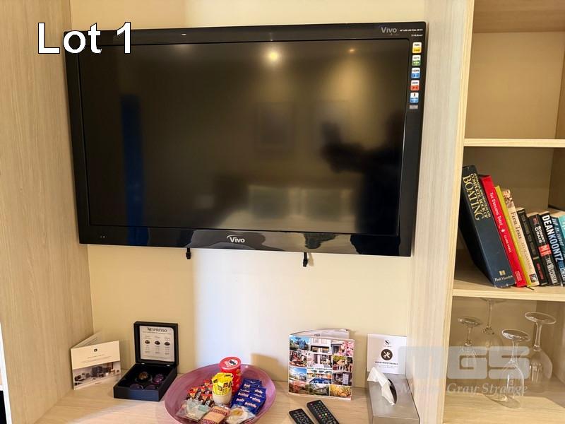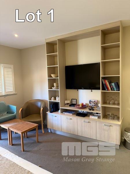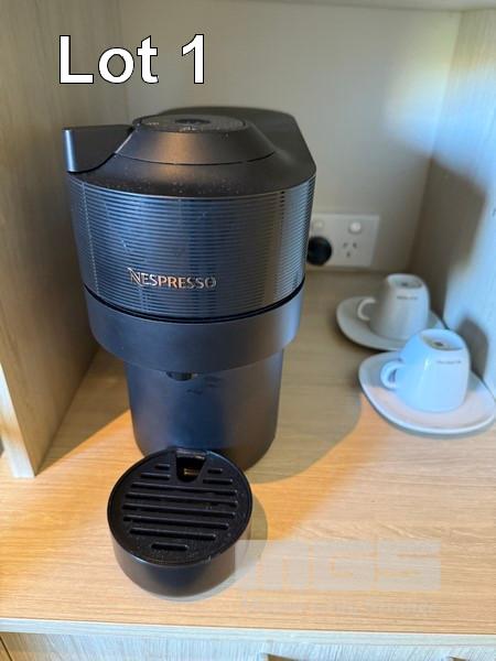 ROOM 1 (89) COMPRISING ALL REMOVABLE CHATTELS, INCLUDING KINGSIZE ENSEMBLE WITH HEADBOARD & LINEN 2 x BEDSIDE TABLE LAMPS WITH ROUND WHITE SHADE 2 x STAINLESS STEEL DRUM STYLE BEDSIDE TABLES, 50cm VIVO 46" LCD HD TELEVISION NESPRESSO COFFEE MACHINE, MODEL VERTUO POP GDV2 TUB STYLE ARM CHAIR, TIMBER FRAMED, BEIGE VINYL DINING TABLE, 100cm DIAMETER, TIMBER & 4 DINING CHAIRS PESKOE BAR FRIDGE STAINLESS STEEL MICROWAVE OVEN, SENSOR TOUCH CONTROLS IRON & COMPACT IRONING BOARD KETTLE, TOASTER, FRYPAN, CUTLERY, CROCKERY & GLASSWARE 3 x FRAMED PRINTS 2 x BINS YEALINK TELEPHONE HANDSET 4 x ALFRESCO CHAIRS, GREEN PVC 2 x TIMBER ALFRESCO SIDE TABLES, 50 x 50cm