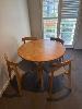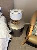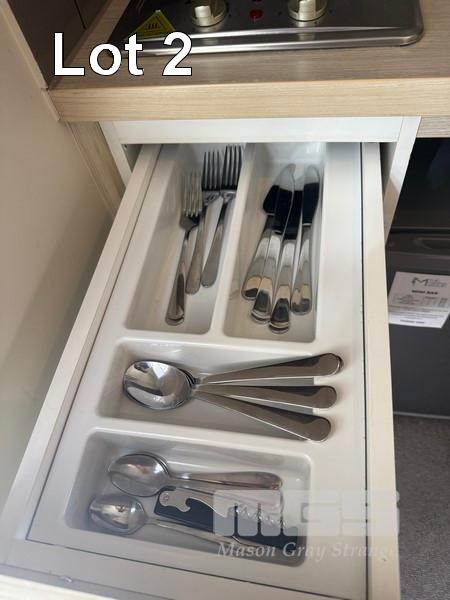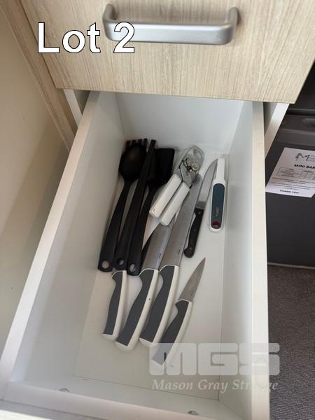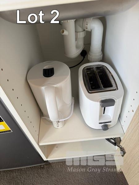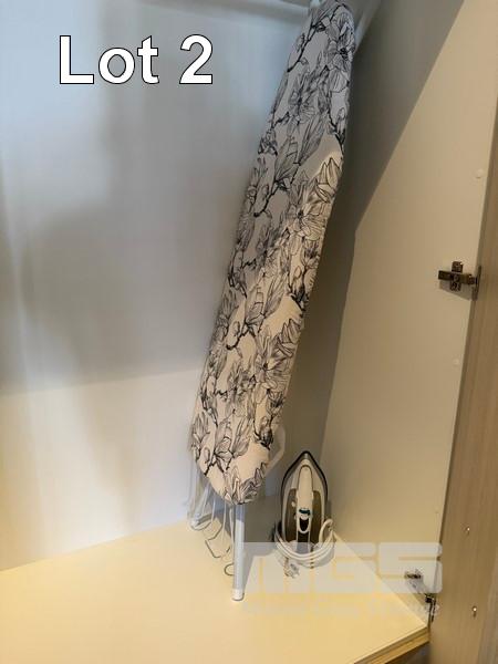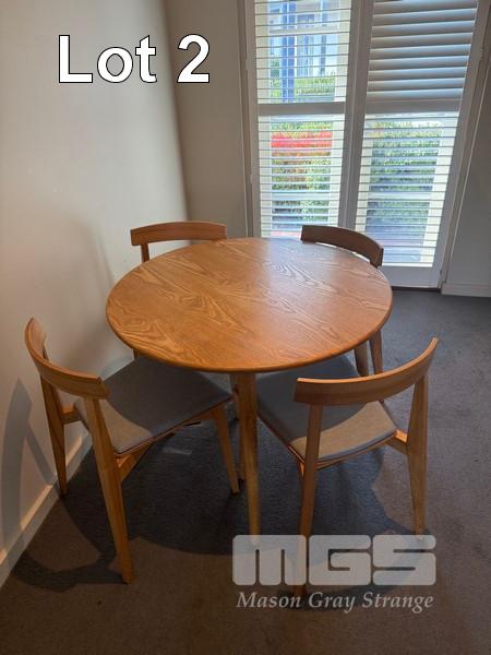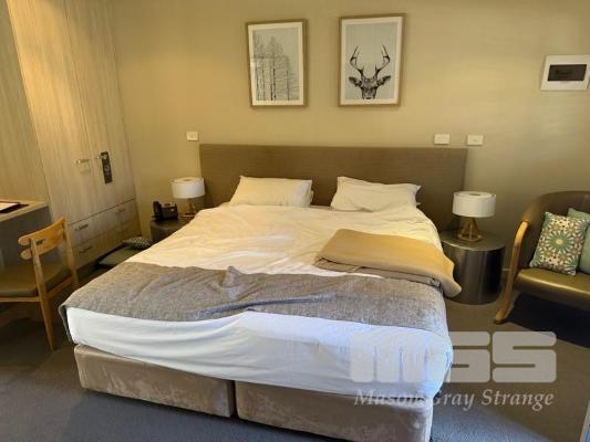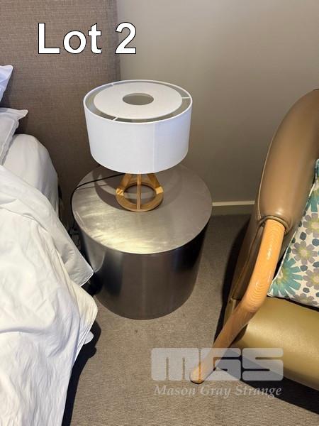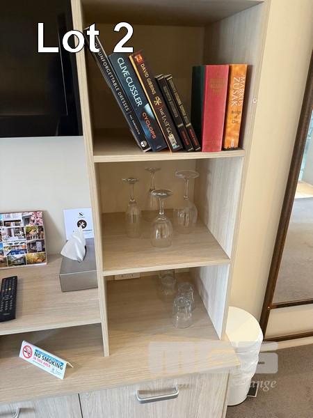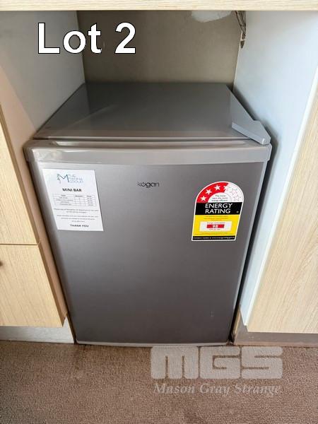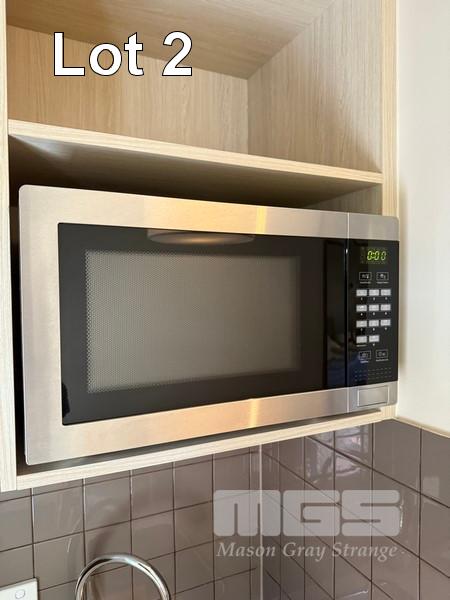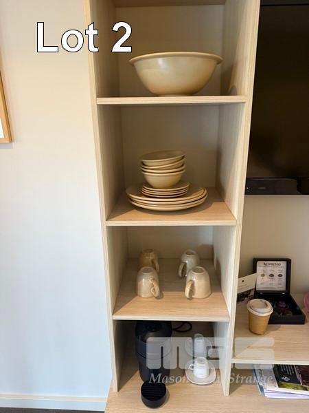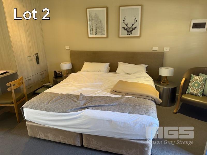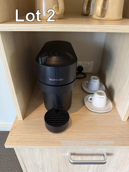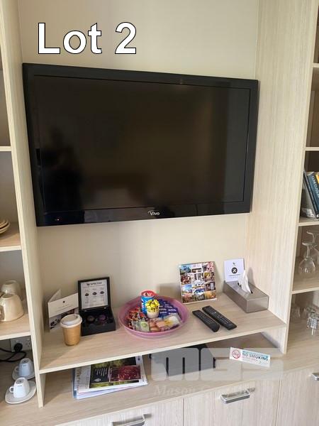 ROOM 2 (88) COMPRISING ALL REMOVABLE CHATTELS, INCLUDING KINGSIZE ENSEMBLE WITH HEADBOARD & LINEN 2 x BEDSIDE TABLE LAMPS WITH ROUND WHITE SHADE 2 x STAINLESS STEEL DRUM STYLE BEDSIDE TABLES, 50cm VIVO 46" LCD HD TELEVISION NESPRESSO COFFEE MACHINE, MODEL VERTUO POP GDV2 TUB STYLE ARM CHAIR, TIMBER FRAMED, BEIGE VINYL DINING TABLE, 100cm DIAMETER, TIMBER & 4 DINING CHAIRS KOGAN BAR FRIDGE, APPROX. 46 LITRE STAINLESS STEEL MICROWAVE OVEN, SENSOR TOUCH CONTROLS IRON & COMPACT IRONING BOARD KETTLE, TOASTER, FRYPAN, CUTLERY, CROCKERY & GLASSWARE 3 x FRAMED PRINTS 2 x BINS YEALINK TELEPHONE HANDSET