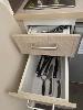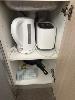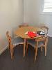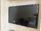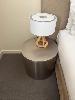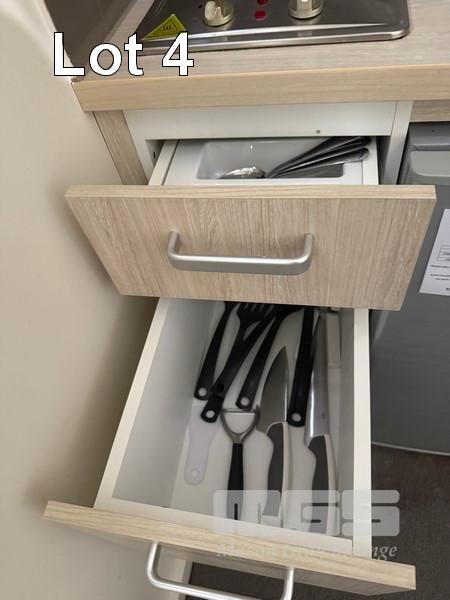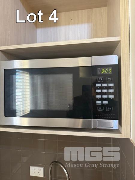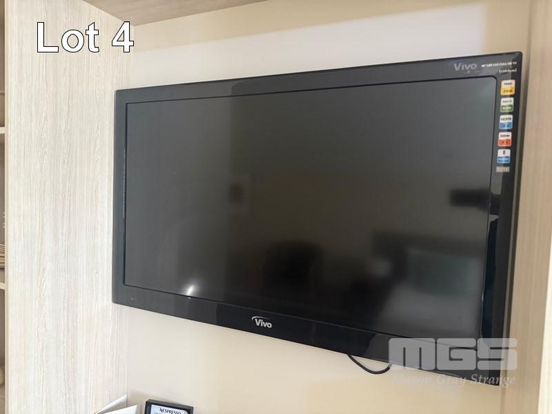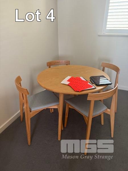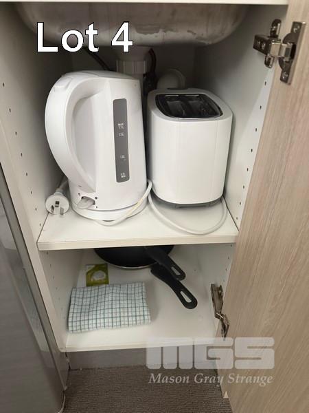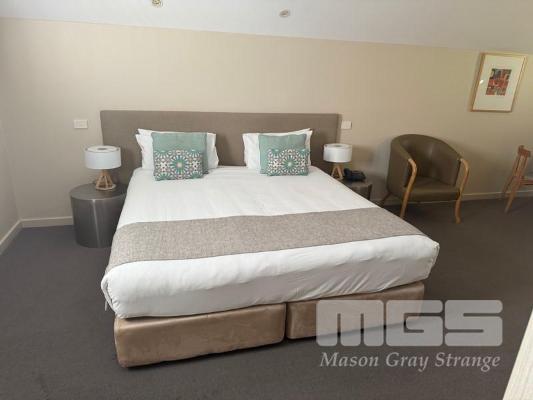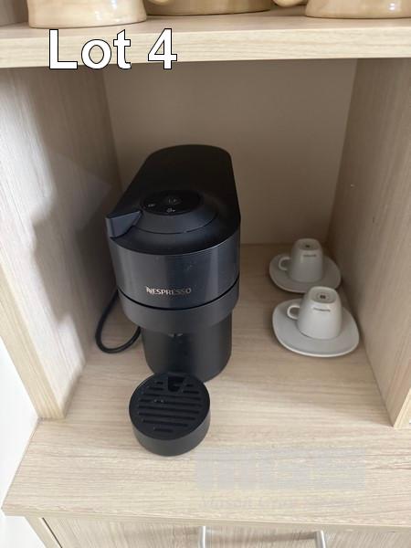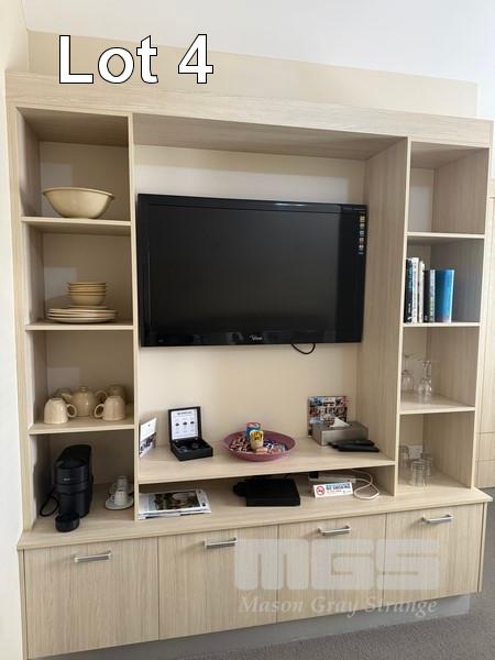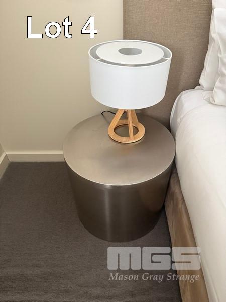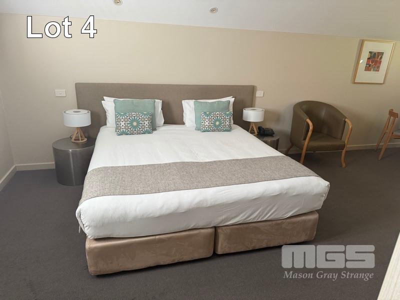 ROOM 4 (87) COMPRISING ALL REMOVABLE CHATTELS, INCLUDING KINGSIZE ENSEMBLE WITH HEADBOARD & LINEN 2 x BEDSIDE TABLE LAMPS WITH ROUND WHITE SHADE 2 x STAINLESS STEEL DRUM STYLE BEDSIDE TABLES, 50cm VIVO 46" LCD HD TELEVISION NESPRESSO COFFEE MACHINE, MODEL VERTUO POP GDV2 TUB STYLE ARM CHAIR, TIMBER FRAMED, BEIGE VINYL DINING TABLE, 100cm DIAMETER, TIMBER & 4 DINING CHAIRS PESKOE BAR FRIDGE STAINLESS STEEL MICROWAVE OVEN, SENSOR TOUCH CONTROLS IRON & COMPACT IRONING BOARD KETTLE, TOASTER, FRYPAN, CUTLERY, CROCKERY & GLASSWARE 3 x FRAMED PRINTS 2 x BINS YEALINK TELEPHONE HANDSET