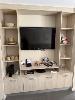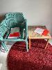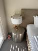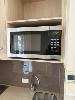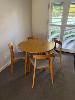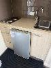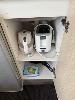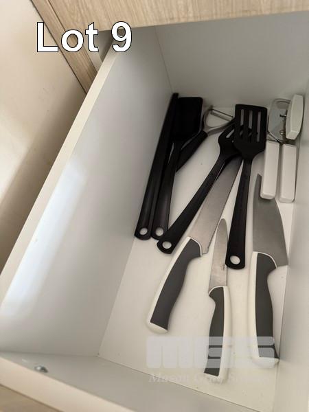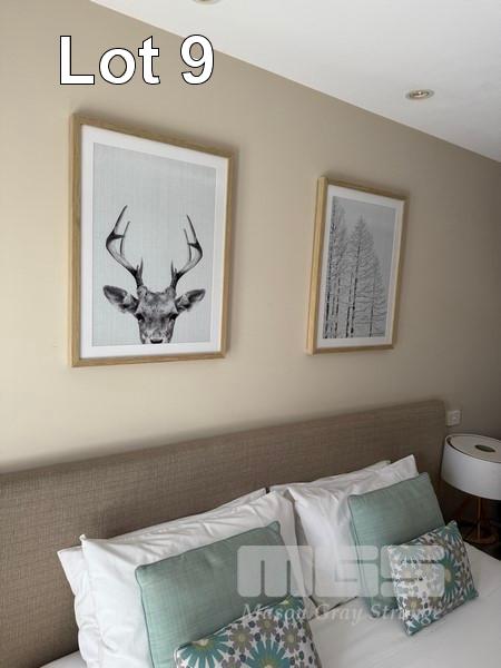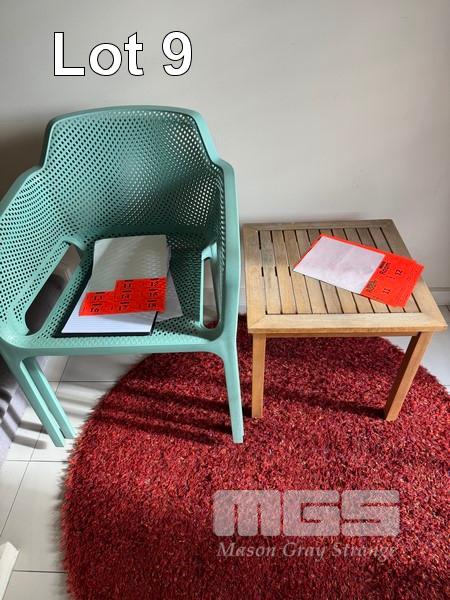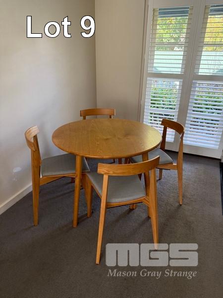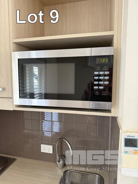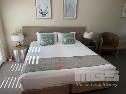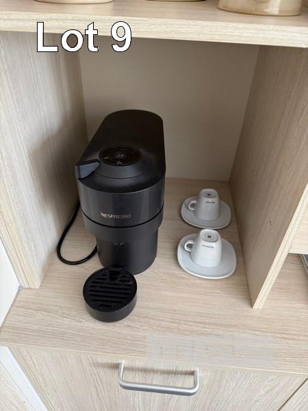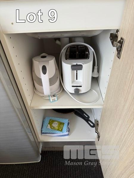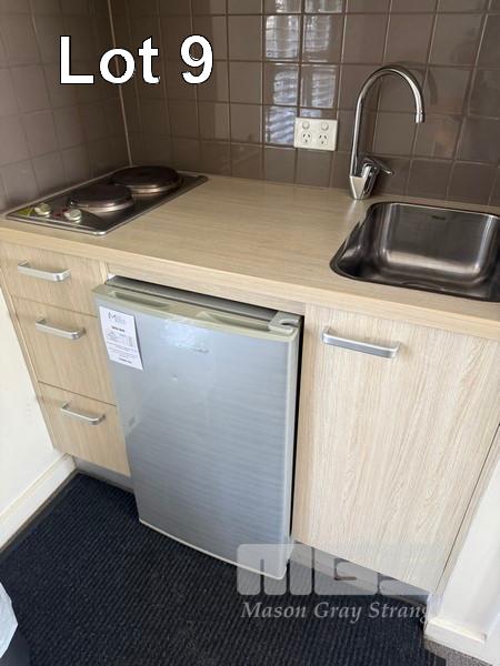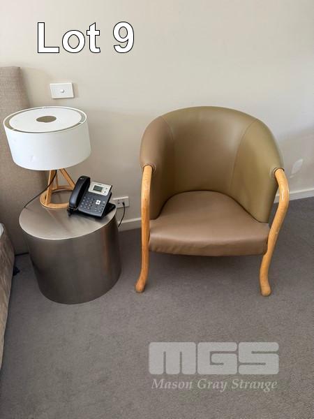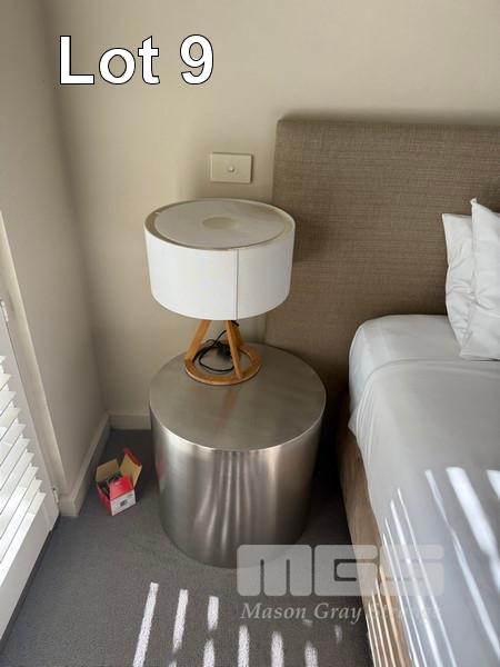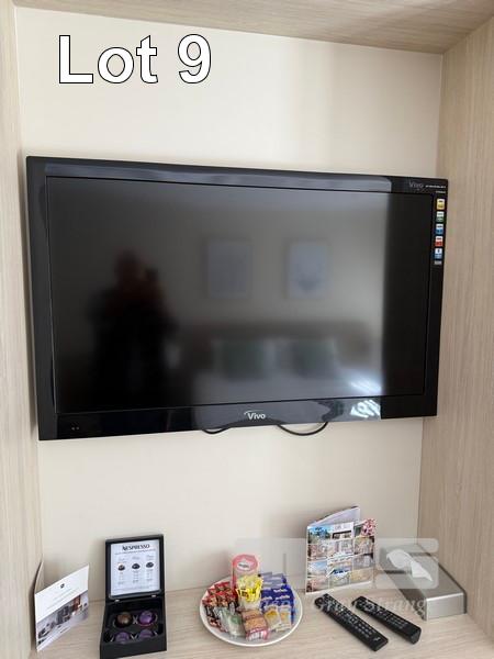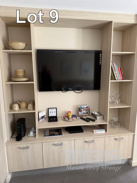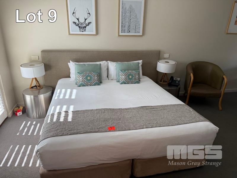 ROOM 9 (80) COMPRISING ALL REMOVABLE CHATTELS, INCLUDING KINGSIZE ENSEMBLE WITH HEADBOARD & LINEN 2 x BEDSIDE TABLE LAMPS WITH ROUND WHITE SHADE 2 x STAINLESS STEEL DRUM STYLE BEDSIDE TABLES, 50cm VIVO 46" LCD HD TELEVISION NESPRESSO COFFEE MACHINE, MODEL VERTUO POP GDV2 TUB STYLE ARM CHAIR, TIMBER FRAMED, BEIGE VINYL DINING TABLE, 100cm DIAMETER, TIMBER & 4 DINING CHAIRS PESKOE BAR FRIDGE STAINLESS STEEL MICROWAVE OVEN, SENSOR TOUCH CONTROLS IRON & COMPACT IRONING BOARD KETTLE, TOASTER, FRYPAN, CUTLERY, CROCKERY & GLASSWARE 3 x FRAMED PRINTS 2 x BINS YEALINK TELEPHONE HANDSET 2 x ALFRESCO CHAIRS, GREEN PVC 1 x TIMBER ALFRESCO SIDE TABLE, 50 x 50cm 1 x CIRCULAR RUG, RED
