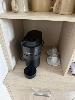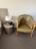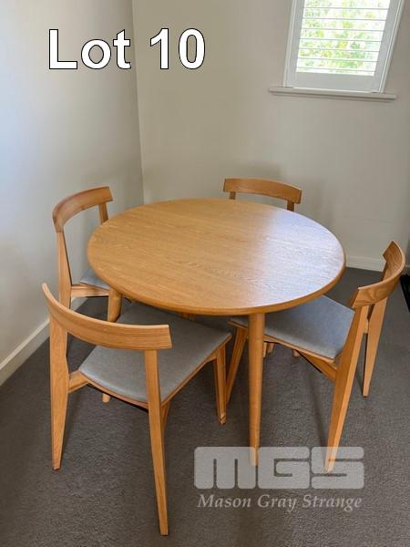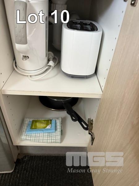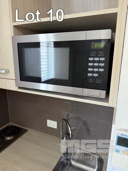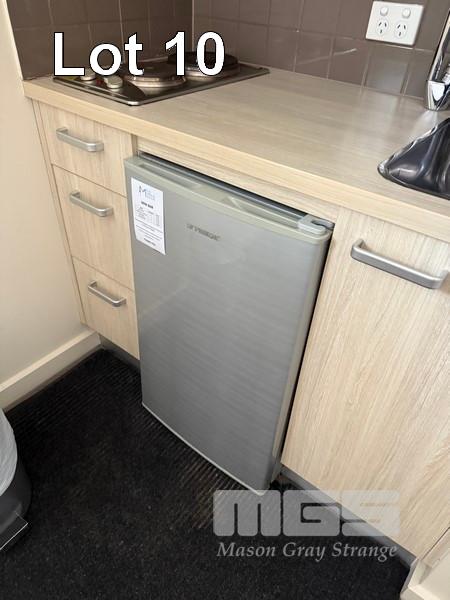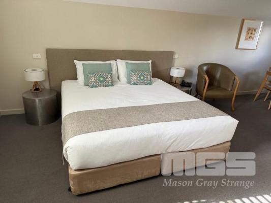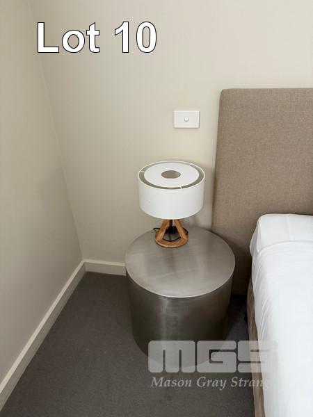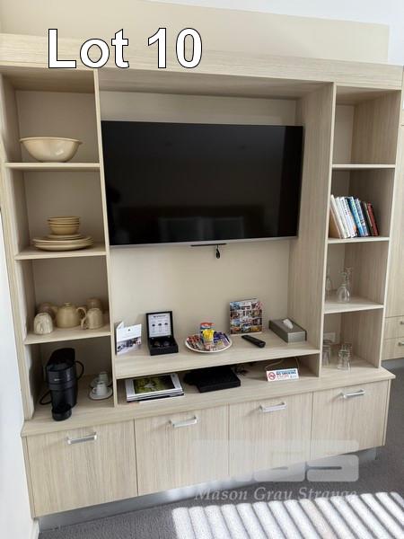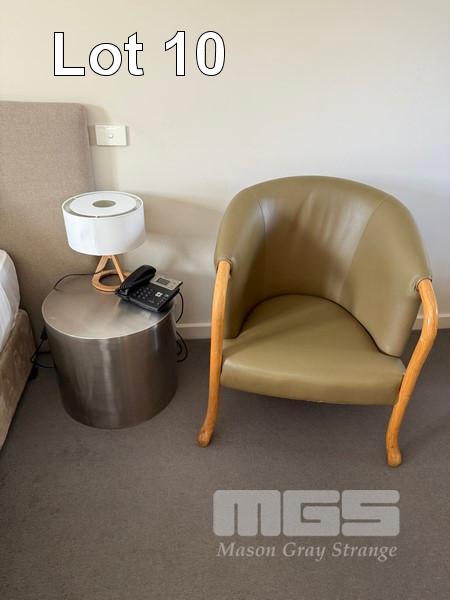 ROOM 10 (81) COMPRISING ALL REMOVABLE CHATTELS, INCLUDING KINGSIZE ENSEMBLE WITH HEADBOARD & LINEN 2 x BEDSIDE TABLE LAMPS WITH ROUND WHITE SHADE 2 x STAINLESS STEEL DRUM STYLE BEDSIDE TABLES, 50cm TCL 46" LED TELEVISION NESPRESSO COFFEE MACHINE, MODEL VERTUO POP GDV2 TUB STYLE ARM CHAIR, TIMBER FRAMED, BEIGE VINYL DINING TABLE, 100cm DIAMETER, TIMBER & 4 DINING CHAIRS PESKOE BAR FRIDGE STAINLESS STEEL MICROWAVE OVEN, SENSOR TOUCH CONTROLS IRON & COMPACT IRONING BOARD KETTLE, TOASTER, FRYPAN, CUTLERY, CROCKERY & GLASSWARE 3 x FRAMED PRINTS 2 x BINS YEALINK TELEPHONE HANDSET