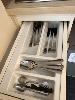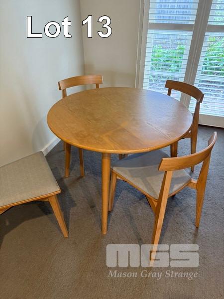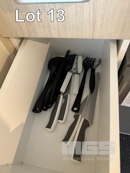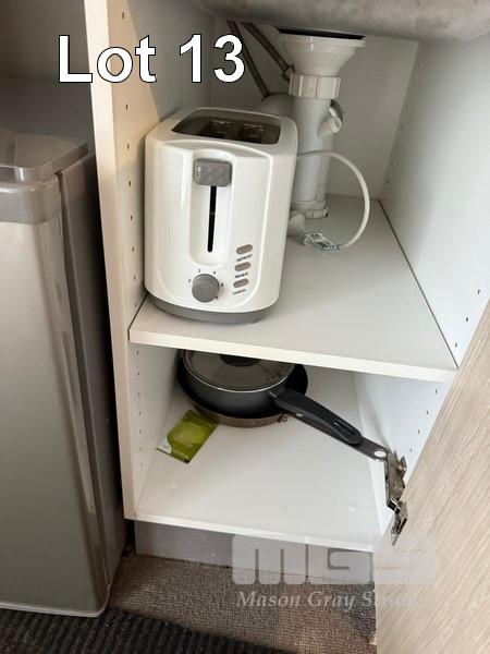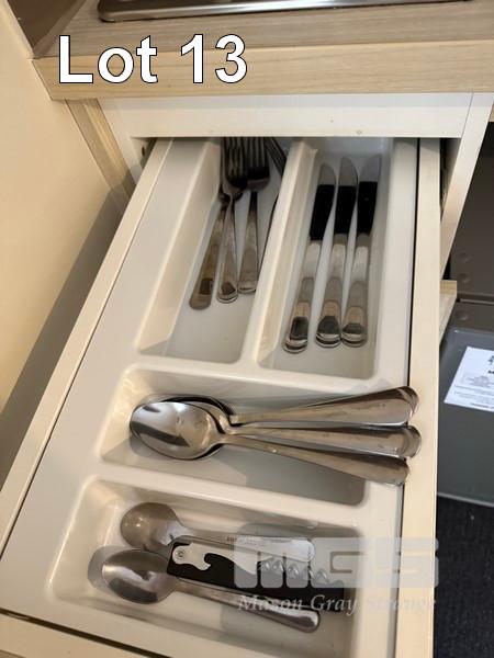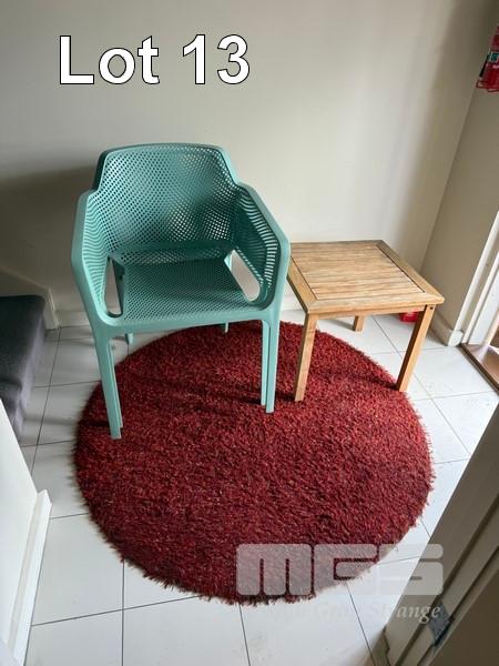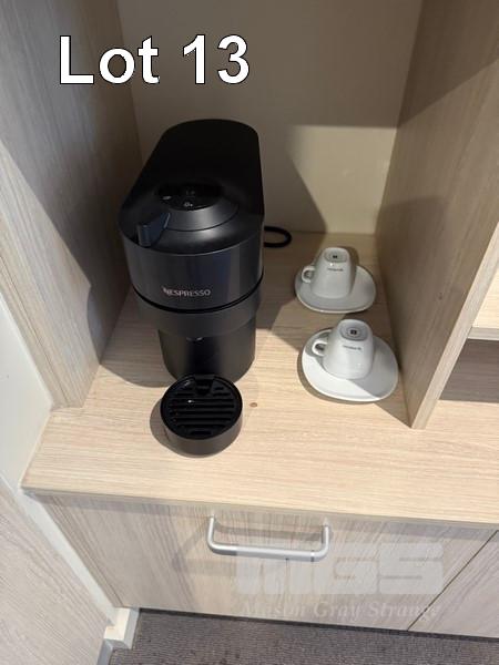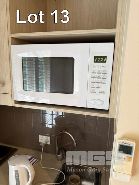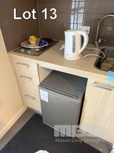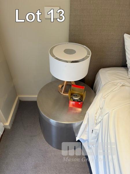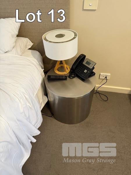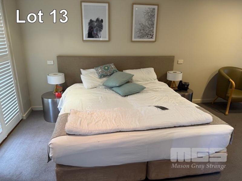 ROOM 13 (76) COMPRISING ALL REMOVABLE CHATTELS, INCLUDING KINGSIZE ENSEMBLE WITH HEADBOARD & LINEN 2 x BEDSIDE TABLE LAMPS WITH ROUND WHITE SHADE 2 x STAINLESS STEEL DRUM STYLE BEDSIDE TABLES, 50cm HISENSE 46" LED TELEVISION NESPRESSO COFFEE MACHINE, MODEL VERTUO POP GDV2 TUB STYLE ARM CHAIR, TIMBER FRAMED, BEIGE VINYL DINING TABLE, 100cm DIAMETER, TIMBER & 4 DINING CHAIRS KOGAN MINI BAR FRIDGE STAINLESS STEEL MICROWAVE OVEN, SENSOR TOUCH CONTROLS IRON & COMPACT IRONING BOARD KETTLE, TOASTER, FRYPAN, CUTLERY, CROCKERY & GLASSWARE 3 x FRAMED PRINTS 2 x BINS YEALINK TELEPHONE HANDSET 2 x ALFRESCO CHAIRS, GREEN PVC 1 x TIMBER ALFRESCO SIDE TABLE, 50 x 50cm 1 x CIRCULAR RUG, RED