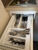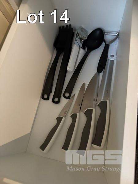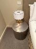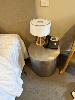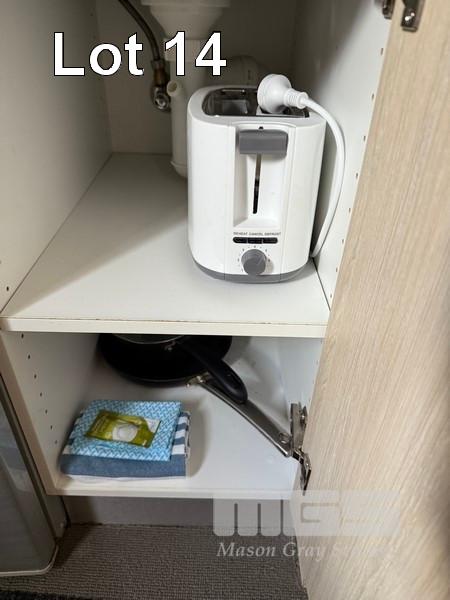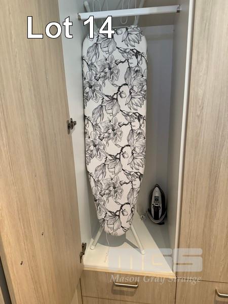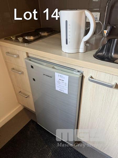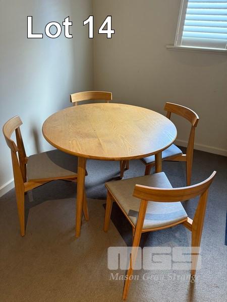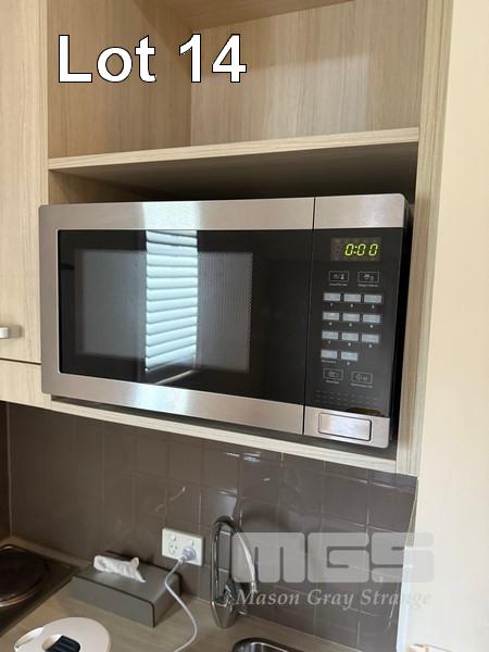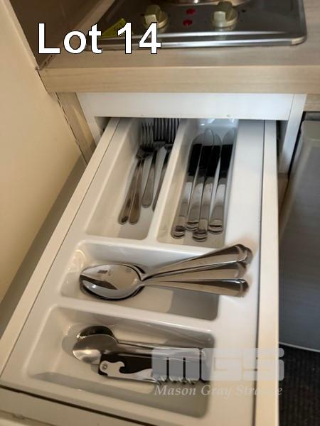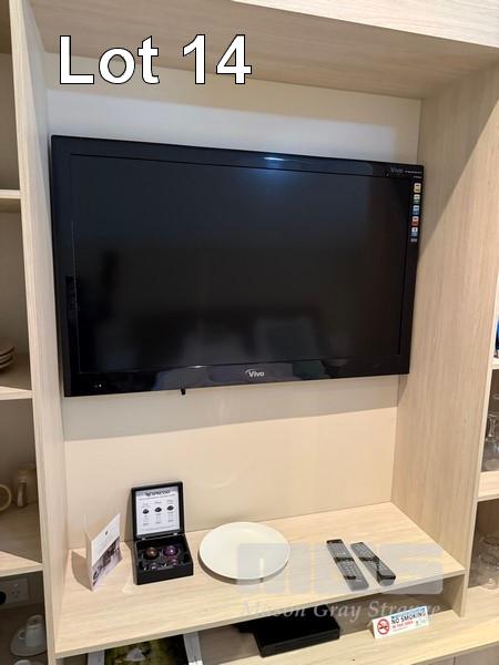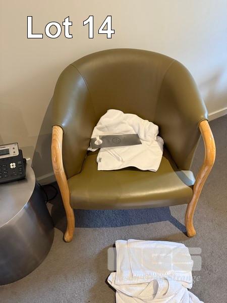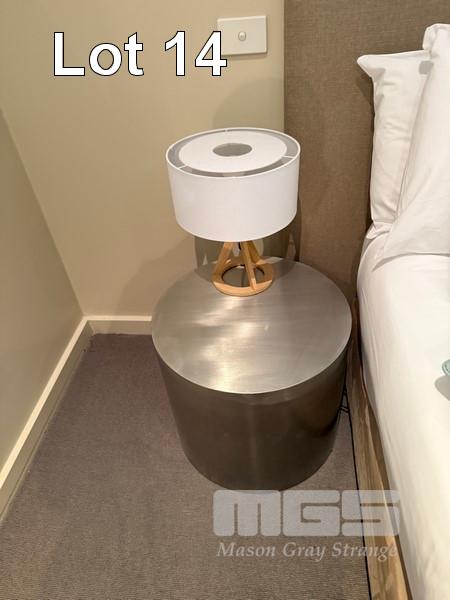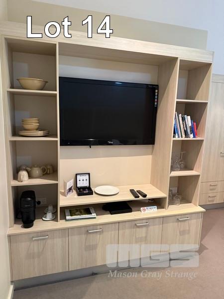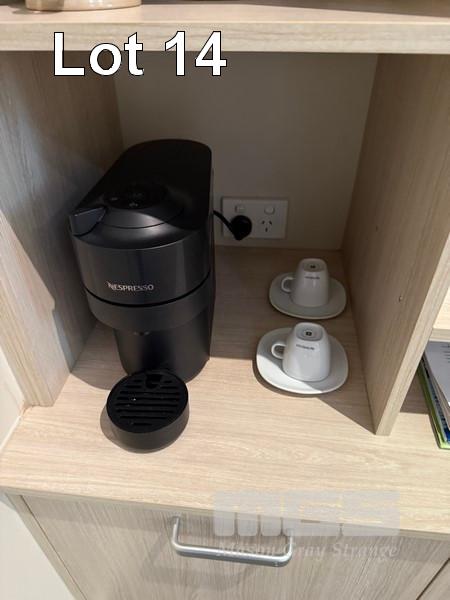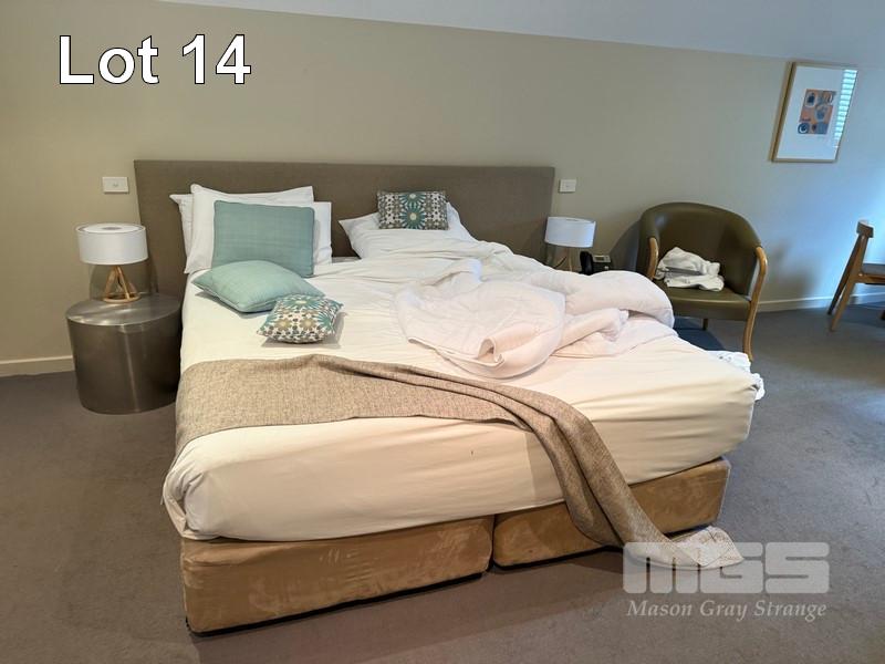 ROOM 14 (77) COMPRISING ALL REMOVABLE CHATTELS, INCLUDING KINGSIZE ENSEMBLE WITH HEADBOARD & LINEN 2 x BEDSIDE TABLE LAMPS WITH ROUND WHITE SHADE 2 x STAINLESS STEEL DRUM STYLE BEDSIDE TABLES, 50cm VIVO 46" LCD HD TELEVISION NESPRESSO COFFEE MACHINE, MODEL VERTUO POP GDV2 TUB STYLE ARM CHAIR, TIMBER FRAMED, BEIGE VINYL DINING TABLE, 100cm DIAMETER, TIMBER & 4 DINING CHAIRS PESKOE BAR FRIDGE STAINLESS STEEL MICROWAVE OVEN, SENSOR TOUCH CONTROLS IRON & COMPACT IRONING BOARD KETTLE, TOASTER, FRYPAN, CUTLERY, CROCKERY & GLASSWARE 3 x FRAMED PRINTS 2 x BINS YEALINK TELEPHONE HANDSET