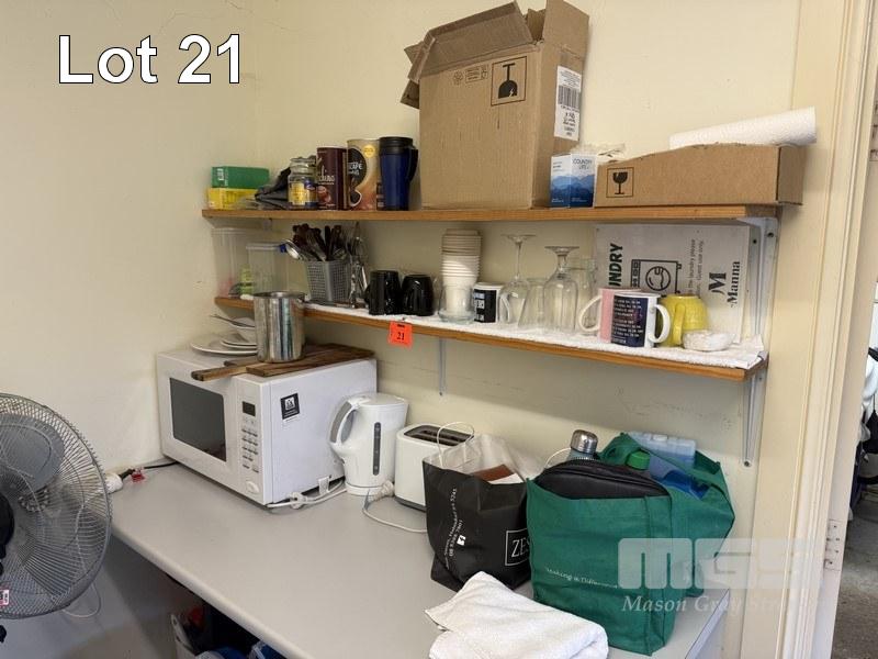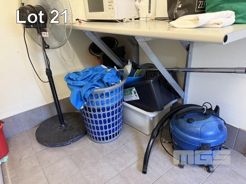 SUNDRY EQUIPMENT, INCL PACVAC GLIDE 300 VACUUM PEDESTAL FAN, MICROWAVE, TOASTER, KETTLE, TUBS, BUCKETS, ETC.