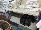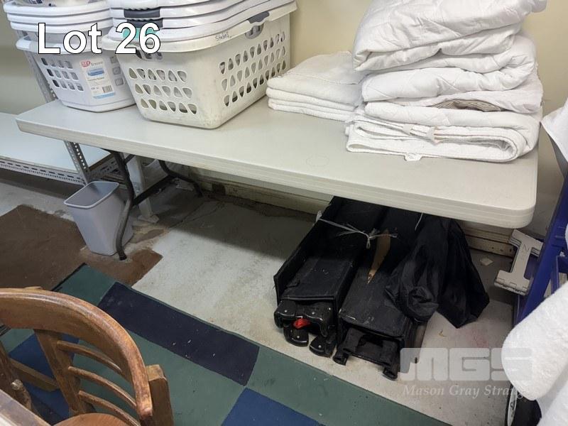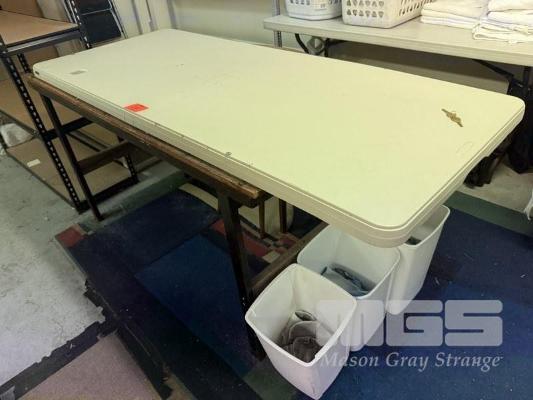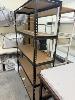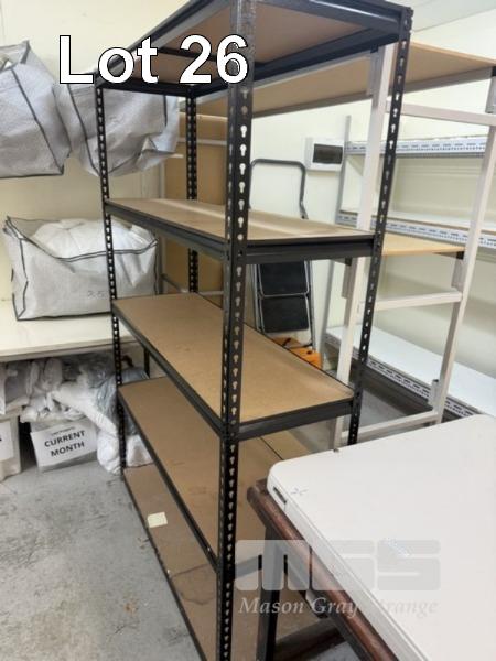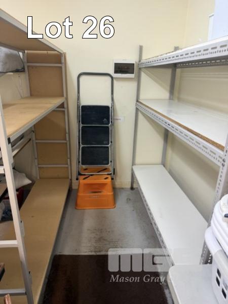 3 BAYS STEEL STOCK SHELVING, EACH 180cm (H) 3 & 5 TIER, 2 x LIFELINE PVC TRESTELS, 180cm 3FT STEP LADDER, SAFETY STEP & LAUNDRY BASKETS