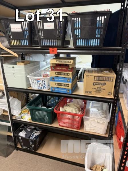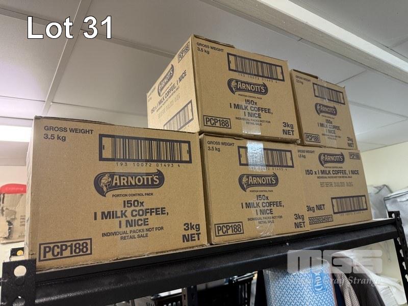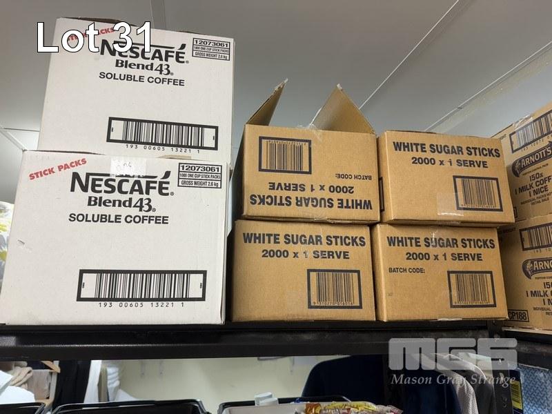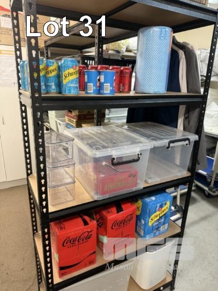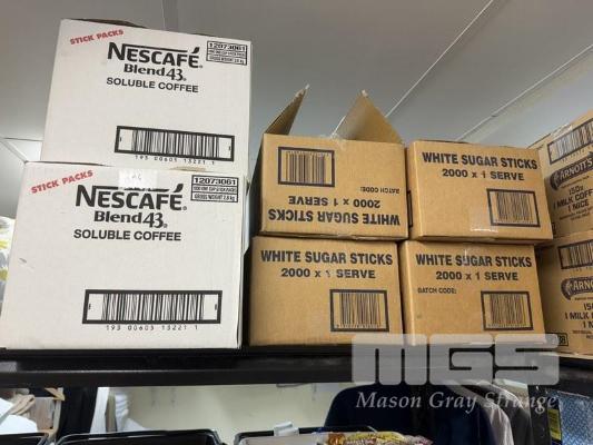 ALL CONSUMABLES, INCL SUGAR SACHETS, COFFEE SACHETS, PRINGLES, ARNOTTS BISCUITS, SOFT DRINKS & CHOCOLATES, WITH 2 STEEL STOCK RACKS, 180 x 90cm & 180 x 120cm