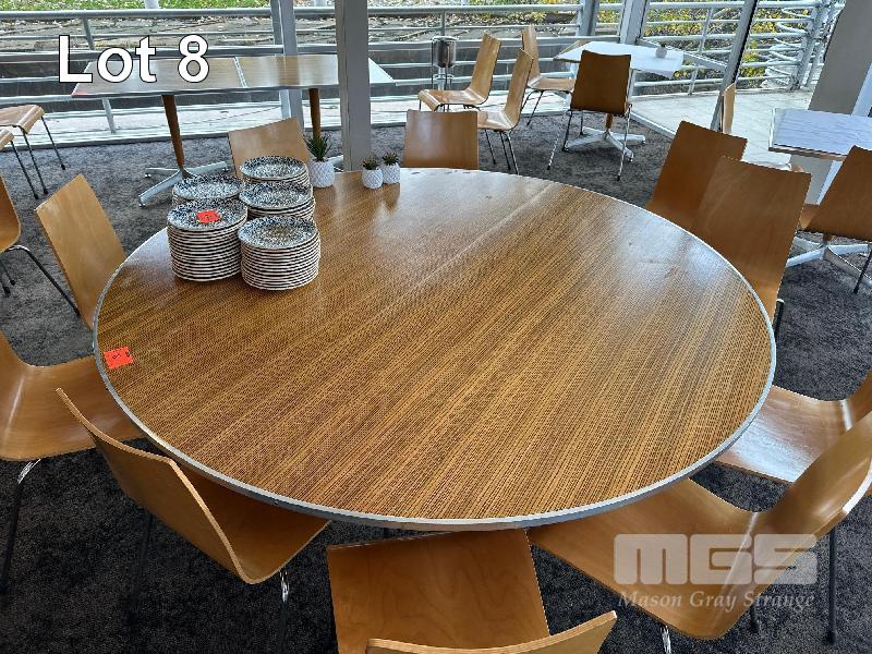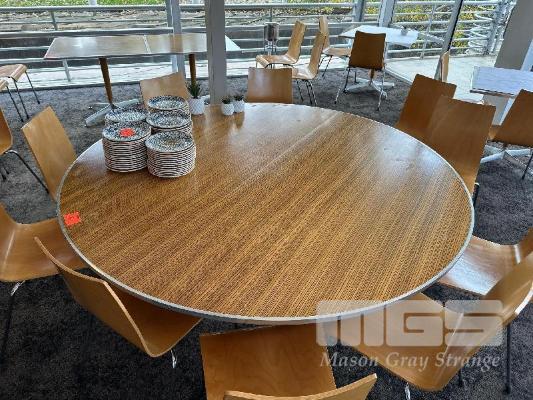 2 x ROUND CAFE TABLES, 1800 & 1530mm, TIMBER LAMINATE, FOLDING