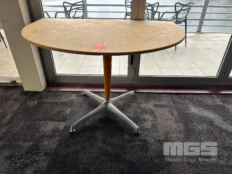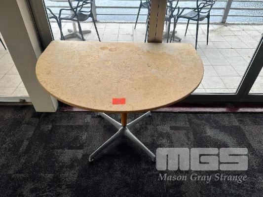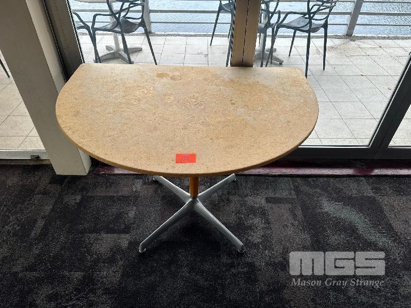 3 x HALF ROUND CAFE TABLES, 1200 x 850mm, PEDESTAL BASE (LOCATED UPSTAIRS)