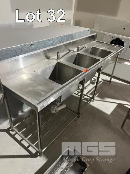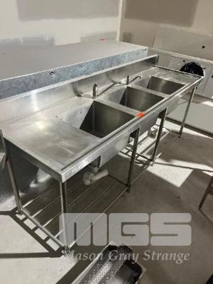 STAINLESS STEEL BENCH WITH 3 x SINKS & SPLASHBACK,