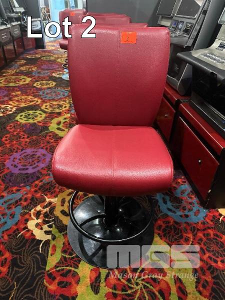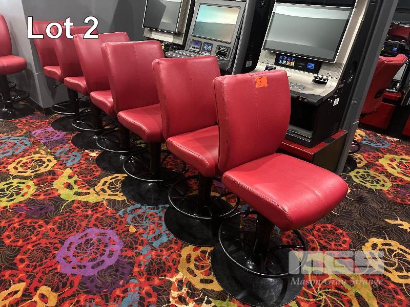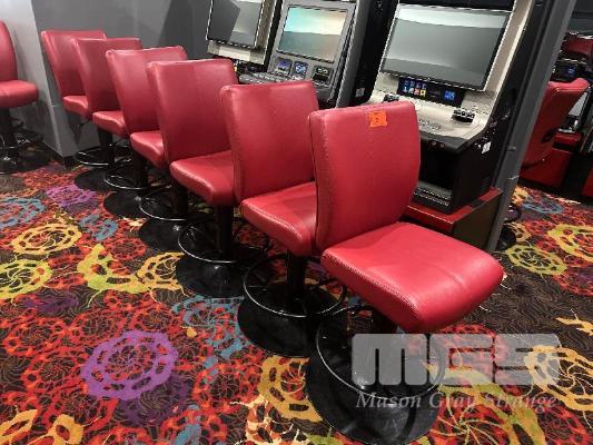 6 x HIGH BACK STOOLS, SWIVEL BASE, RED VINYL, ADJUSTABLE HEIGHT