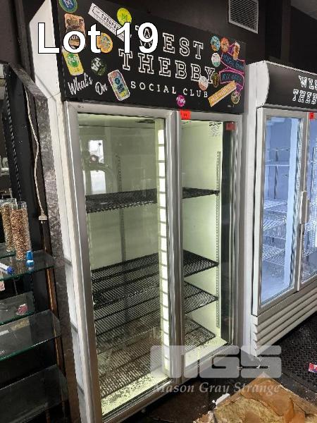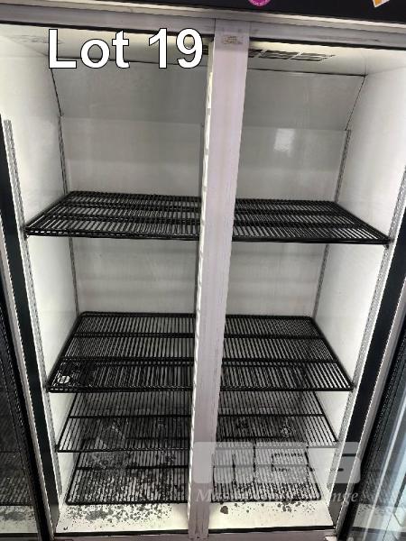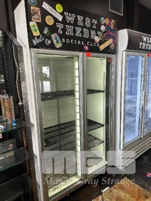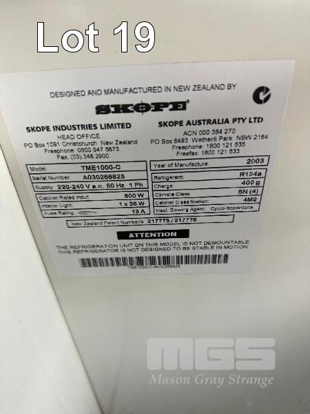 SKOPE 2 DOOR UPRIGHT DISPLAY FRIDGE, MOD: TMR1000-C, 1000L CAP, DOM: 2003, ILLUMINATED, 240V 10amp NOTE: NOT COOLING