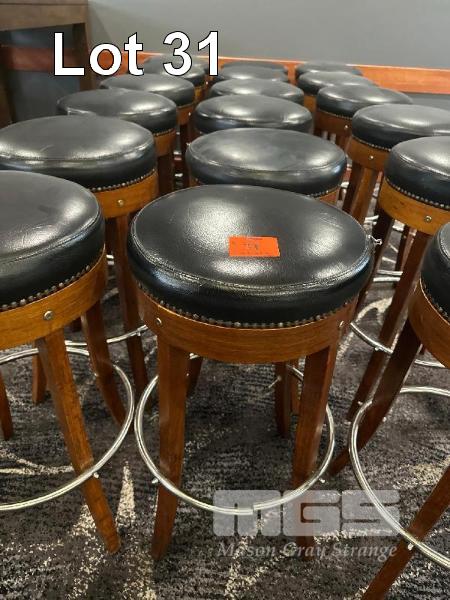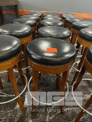 6 x TIMBER BAR STOOLS, BLACK VINYL TOPS, 760mm (H)