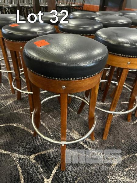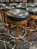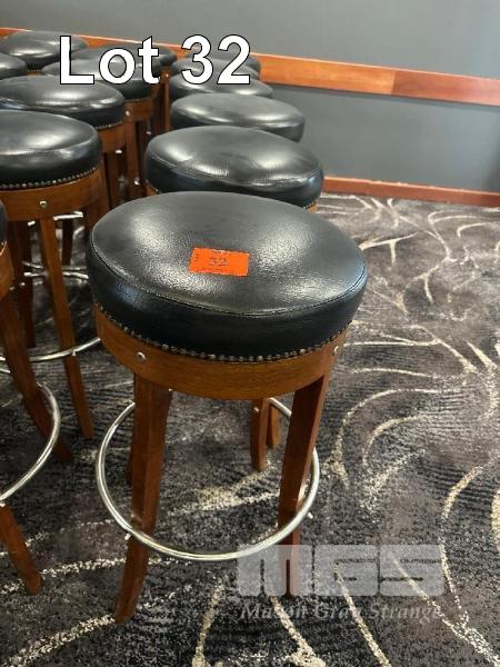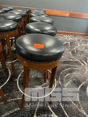 6 x TIMBER BAR STOOLS, BLACK VINYL TOPS, 760mm (H)