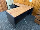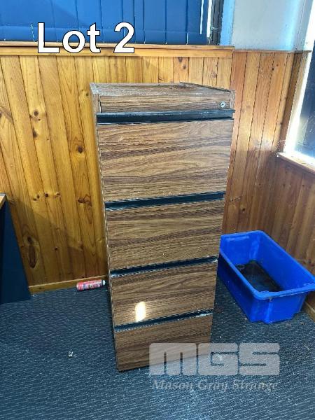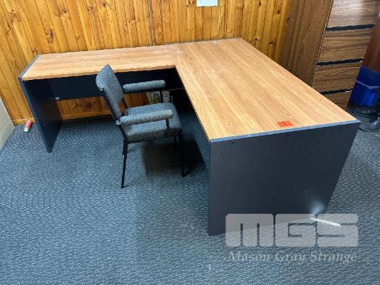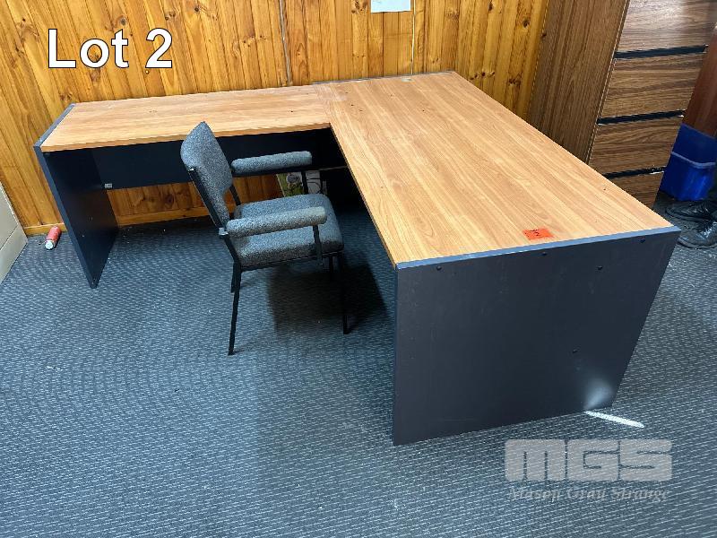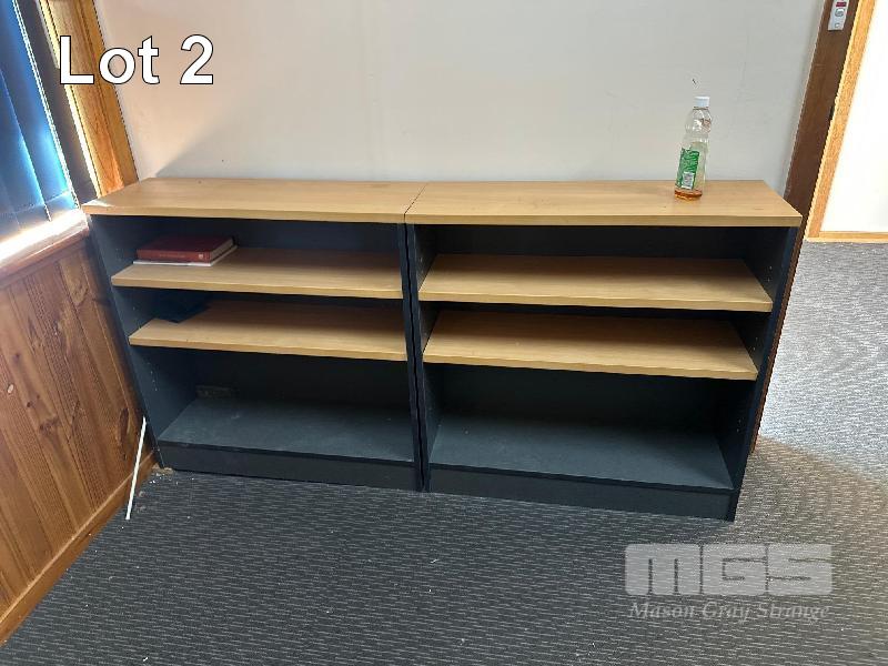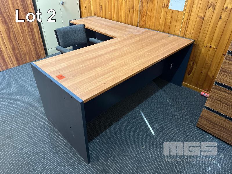 DESK, TIMBER LAMINATE & RETURN,1800 X 2000 mm 2 x LOWLINE BOOKSHELVES, 900 x 900mm & 4 DRAWER FILING CABINET