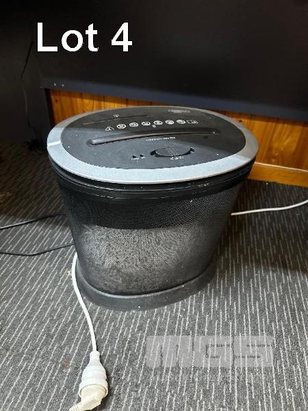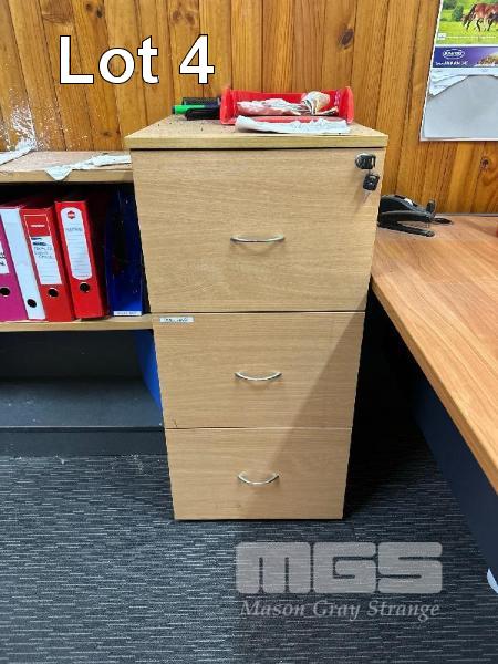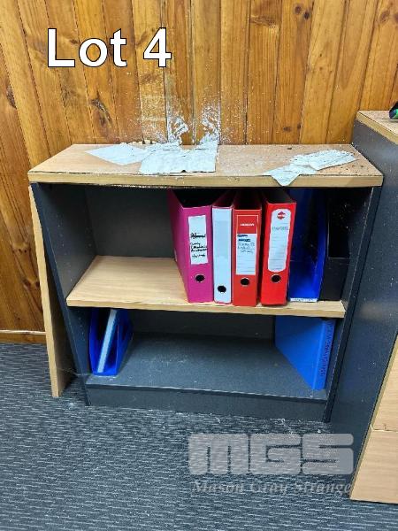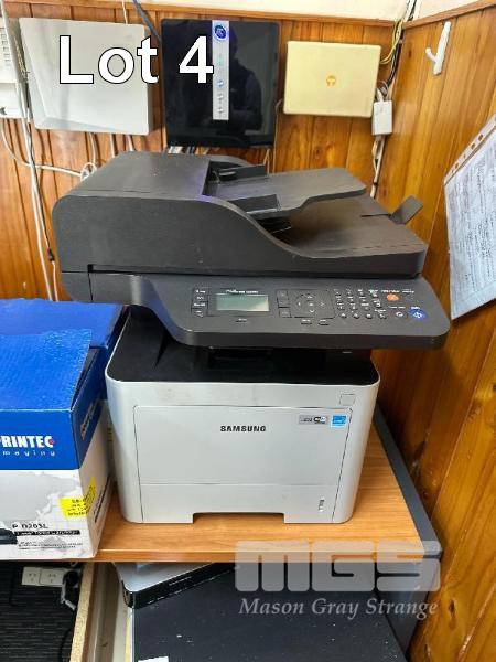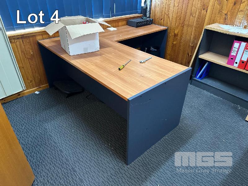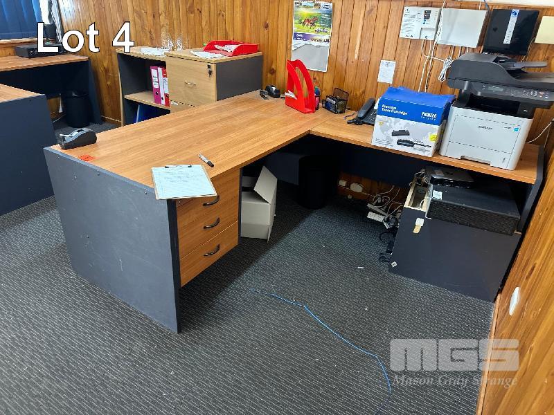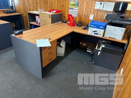 2 x DESKS, & RETURNS,1800 X 2000mm TIMBER LAMINATE, LOWLINE BOOKCASE, 3 DRAWER FILING CABINET, PAPER SHREDDER & SAMSUNG MFC, 3570FW