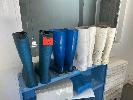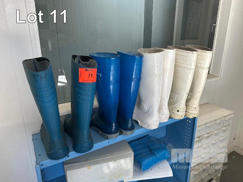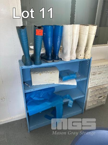 4 PAIRS RUBBER BOOTS, STEEL SHELF UNIT, 4 TIER, 2 x TIMBER 16 DRAWER PARTS RACKS, CAPS, GLOVES & APRONS