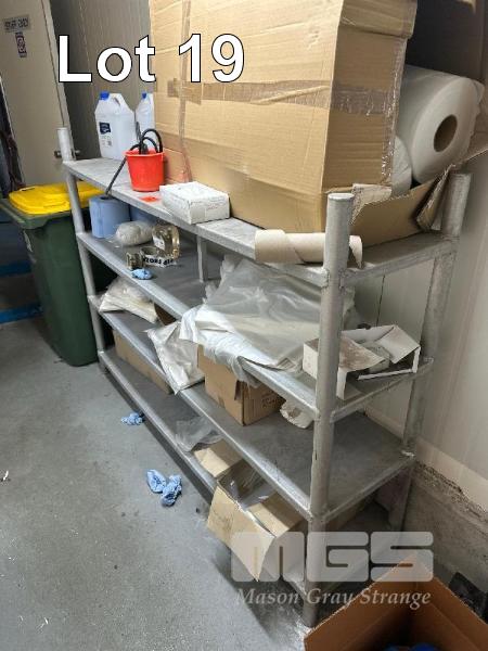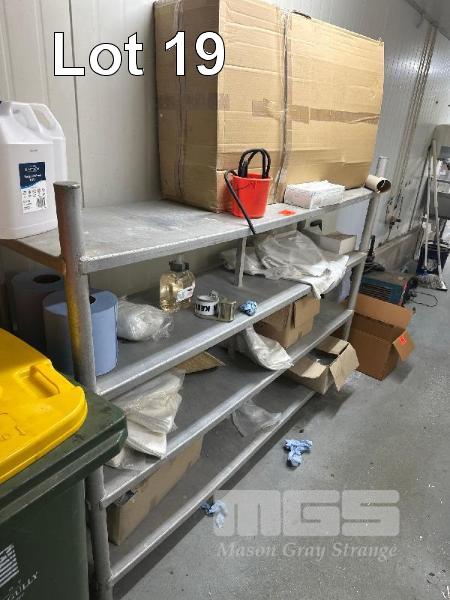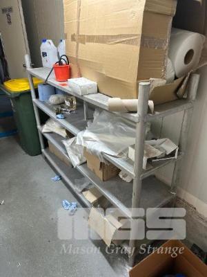 ALUMINIUM STOCK RACK, 1800 (L) x 450 (D) x 1370mm (H), 4 TIER & CONTENTS TOWELS, PLASTIC BAGS, ETC