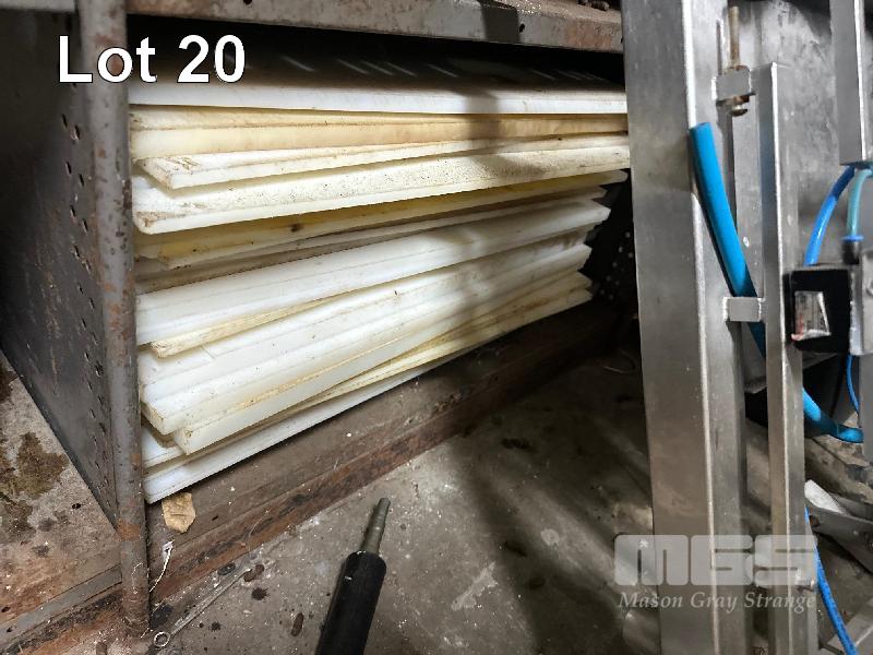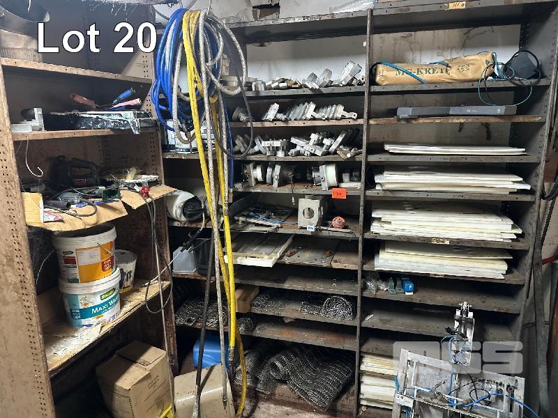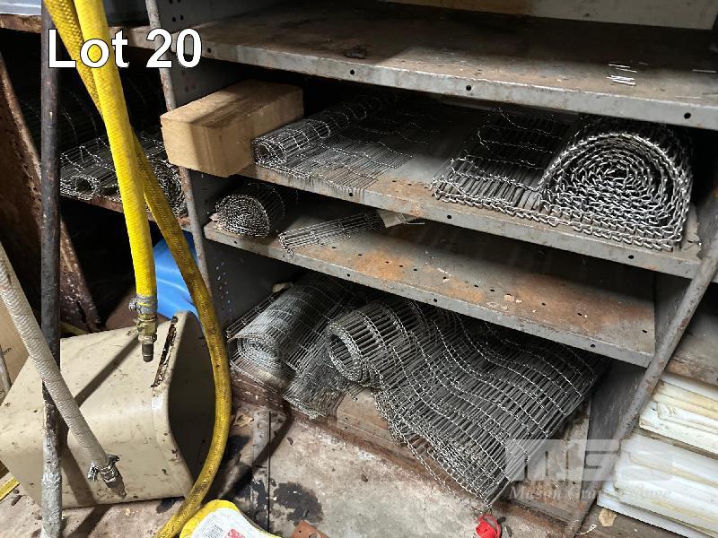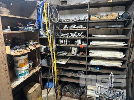 STEEL MODULAR SHELVING, 4 BAY & CONTENTS MACHINE SPARES, NYLON SHEET, STAINLESS STEEL CONVEYOR MESH, BEARINGS & STANDS, HARDWARE.