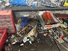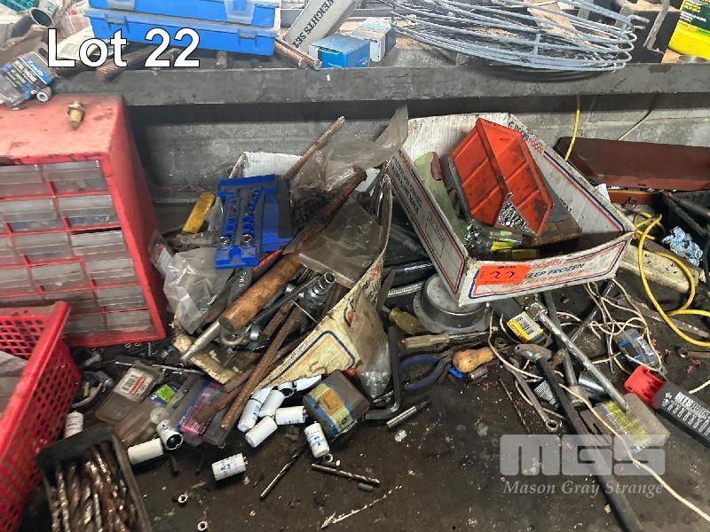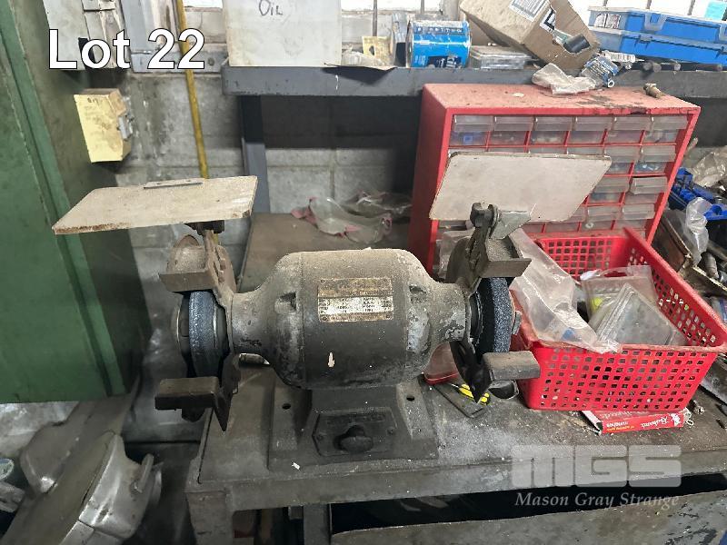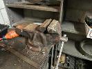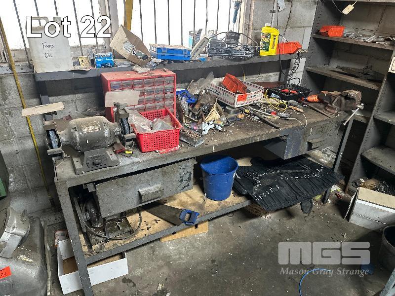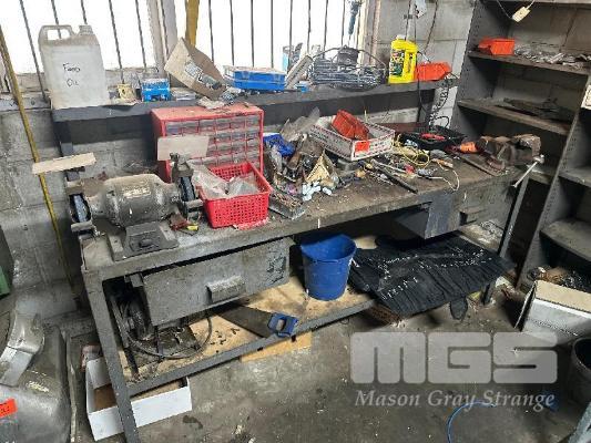 STEEL BENCH & CONTENTS INCLUDING 4" VICE, DE GRINDER, 6" & ASSORTED HAND TOOLS