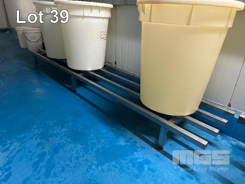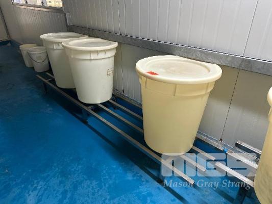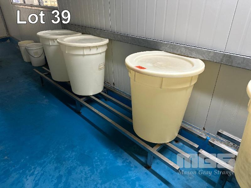 3 x NYLON DRUMS & LIDS, 60 LITRE ON STAINLESS STEEL STAND