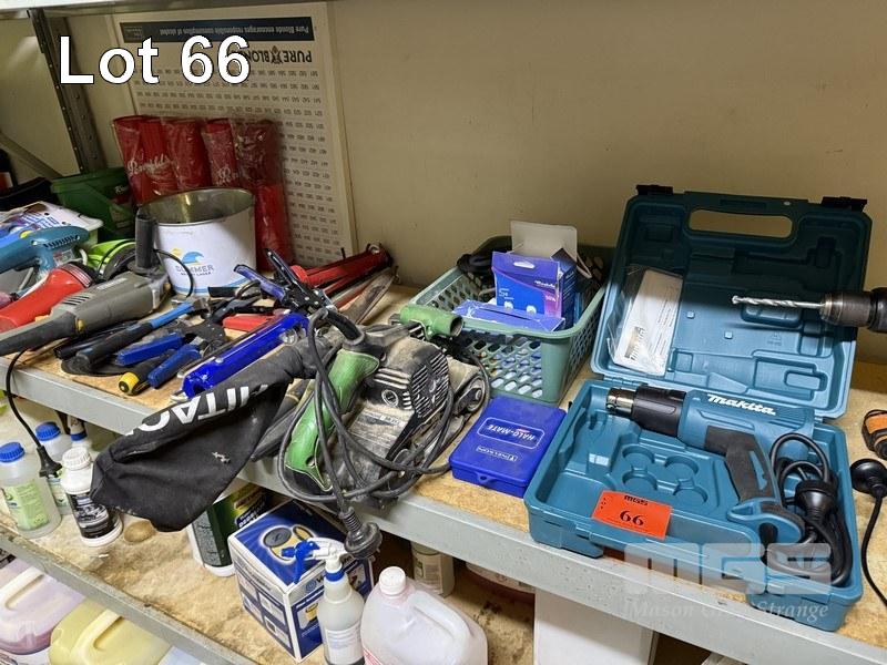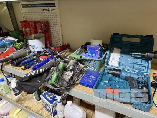 ASSORTED HAND TOOLS & POWER TOOLS INCLUDING, MAKITA HEAT GUN, HITACHI SANDER, SB8V2, MAKITA SANDER, BD3700, WORX CORDLESS DRILL, STILLSONGS, CAULKING GUNS, ETC