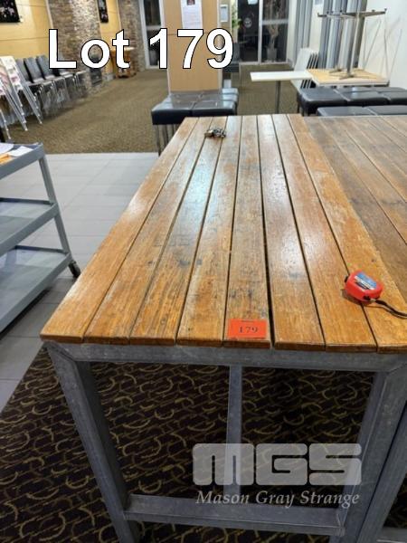 DRY BAR, TIMBER TOP, HEAVY DUTY FRAMED, 200 x 70cm, 6 x BAR TOOLS, BLACK VINYL PADDED (SOME WEAR, RIPS)