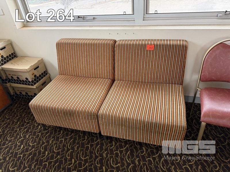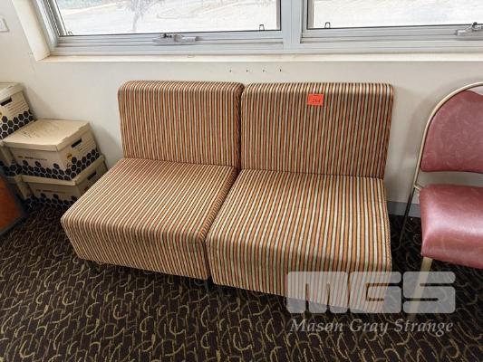 PAIR MODULAR RECEPTION SETTEES, STRIPED FABRIC & RECEPTION SETTEE, GREEN FABRIC