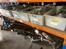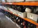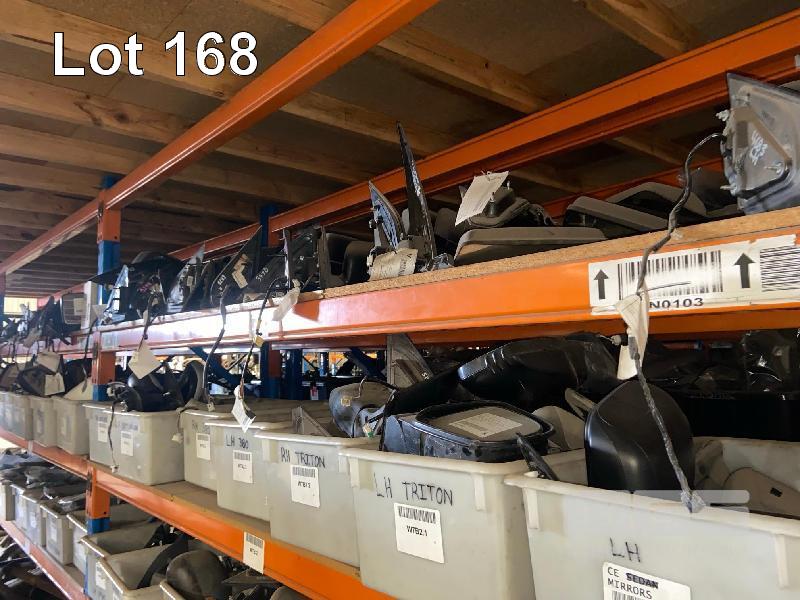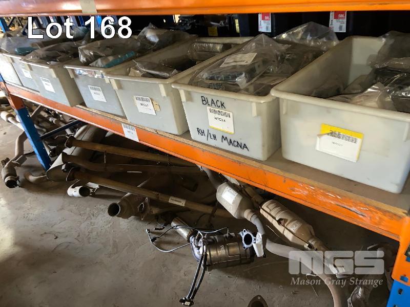 ROW OF RACKING PARTS INCLUDING MIRRORS, TAIL LIGHTS, EXHAUSTS, MUFFLERS, IGNITION SWITCHES, 4 BAYS OF RACKING