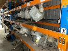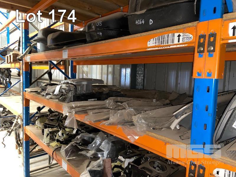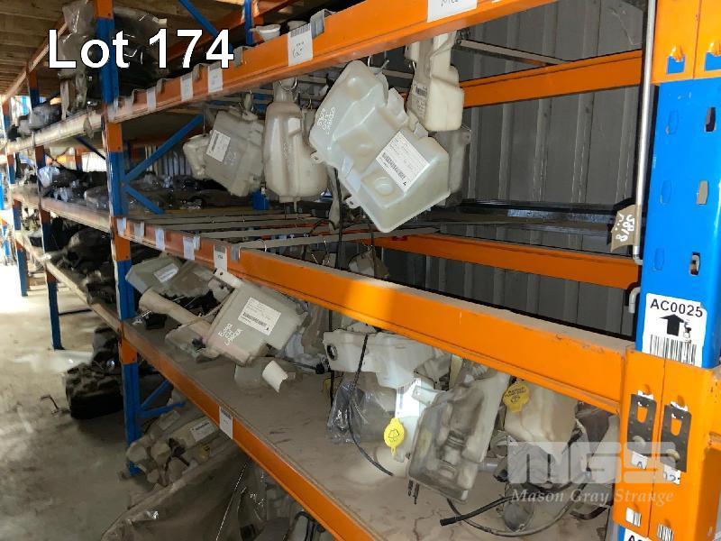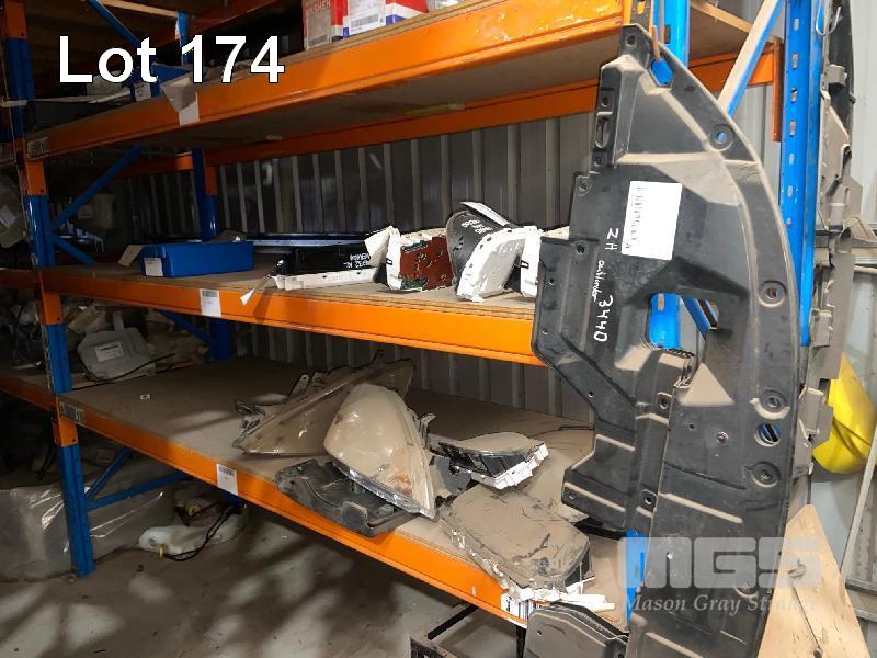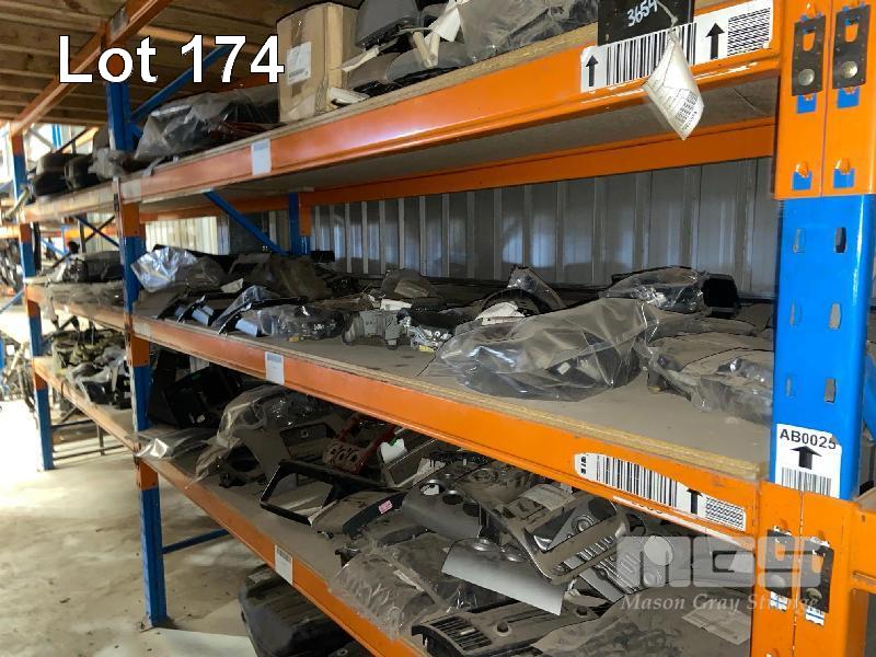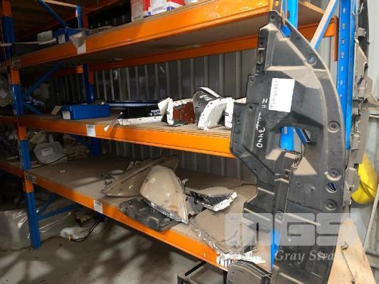 ROW OF RACKING PARTS INCLUDING HEADLIGHTS, GAUGE CLUSTERS, WASHER BOTTLES, TRIM , FUEL TANKS 4 BAYS OF RACKING